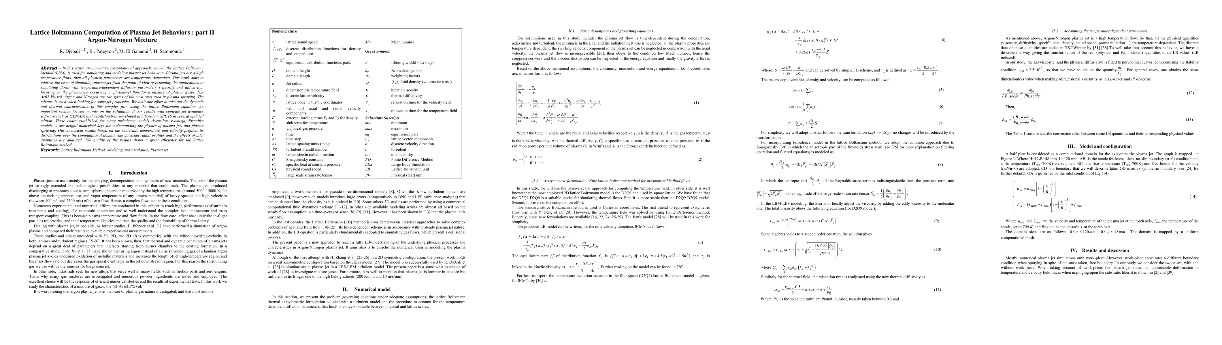 . Plasma jets are a high temperature flows, then all physical parameters are temperature dependent. This work aims to address the issue of simulating plasma-jet from the point of view of extending the applications to simulating flows with temperature-dependent diffusion parameters (viscosity and diffusivity), focusing on the phenomena occurring in plasma-jet flow for a mixture of plasma gases, N2-Ar62.5% vol. Argon and Nitrogen are two gases of the most ones used in plasma spraying. The mixture is used when looking for some jet properties. We limit our effort to take out the dynamic and thermal characteristics of this complex flow using the lattice Boltzmann equation. An important section focuses mainly on the validation of our results with compute jet dynamics software such as GENMIX and Jets & Poudres developed in laboratory SPCTS in several updated edition. These codes established for many turbulence models (k-epsilon, k-omega, Prandtl's models...) are helpful numerical keys for understanding the physics of plasma jets and plasma spraying.