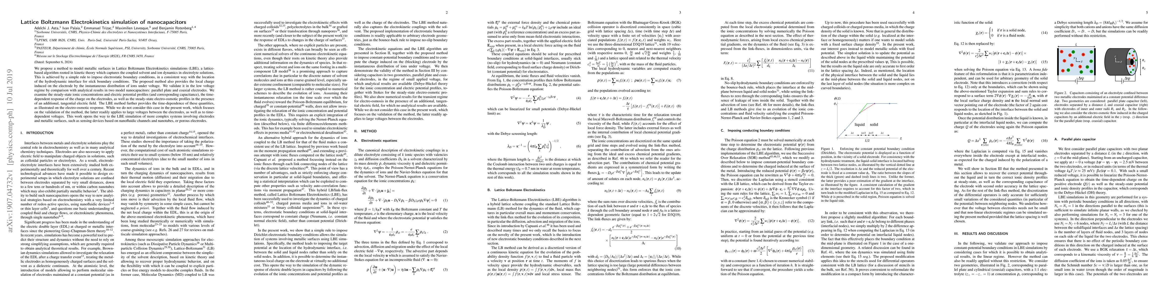 This paper proposes a lattice-based algorithm to simulate electrokinetics in nanocapacitors, validating the method against analytical results for parallel plate and coaxial electrodes. The method captures ionic dynamics and provides local charge distribution on electrodes, paving the way for simulations of complex systems involving metallic surfaces.
