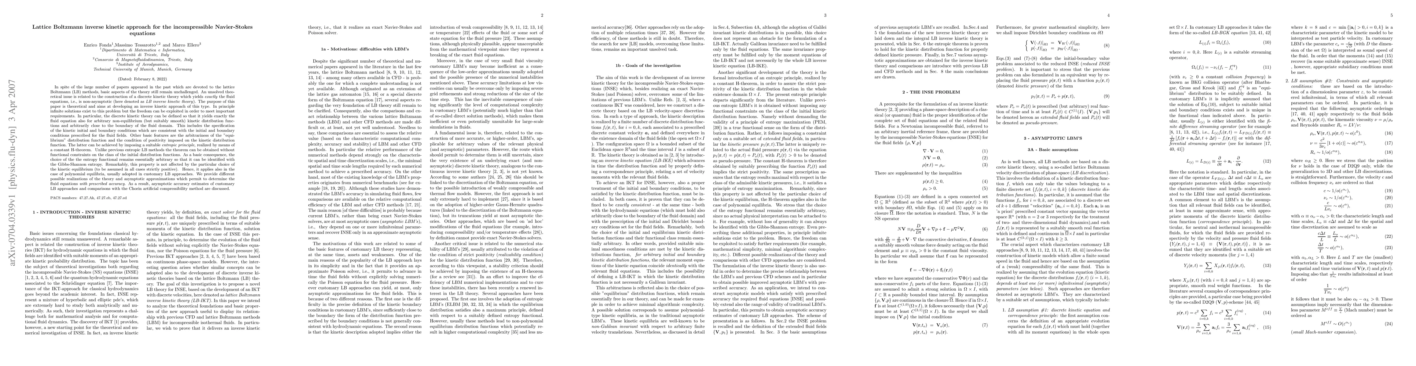 In spite of the large number of papers appeared in the past which are devoted to the lattice Boltzmann (LB) methods, basic aspects of the theory still remain unchallenged. An unsolved theoretical issue is related to the construction of a discrete kinetic theory which yields \textit{exactly} the fluid equations, i.e., is non-asymptotic (here denoted as \textit{LB inverse kinetic theory}). The purpose of this paper is theoretical and aims at developing an inverse kinetic approach of this type. In principle infinite solutions exist to this problem but the freedom can be exploited in order to meet important requirements. In particular, the discrete kinetic theory can be defined so that it yields exactly the fluid equation also for arbitrary non-equilibrium (but suitably smooth) kinetic distribution functions and arbitrarily close to the boundary of the fluid domain. Unlike previous entropic LB methods the theorem can be obtained without functional constraints on the class of the initial distribution functions. Possible realizations of the theory and asymptotic approximations are provided which permit to determine the fluid equations \textit{with prescribed accuracy.} As a result, asymptotic accuracy estimates of customary LB approaches and comparisons with the Chorin artificial compressibility method are discussed.