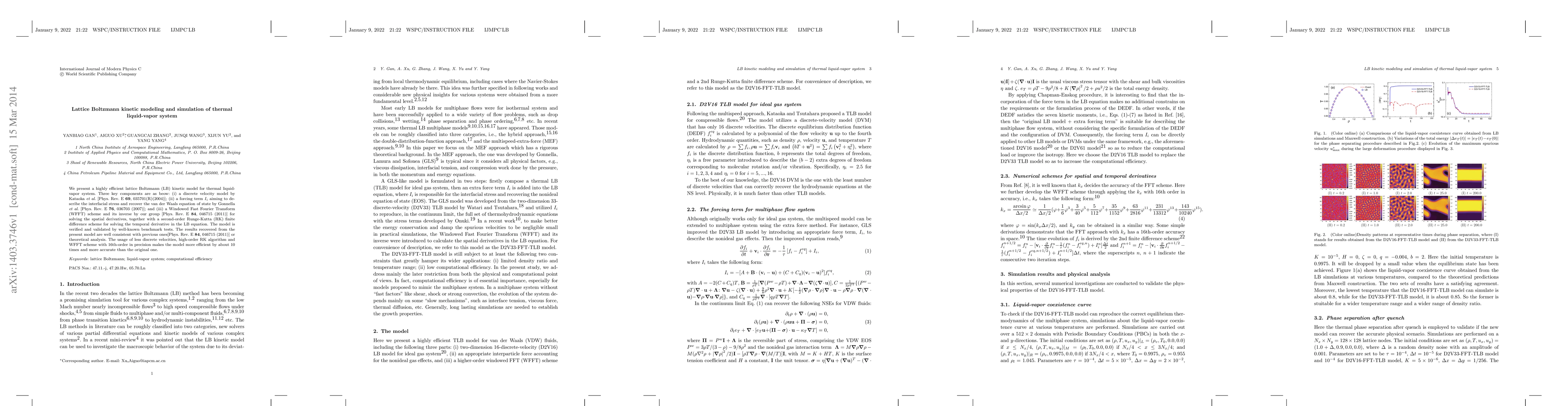 This paper introduces a highly efficient lattice Boltzmann kinetic model for simulating thermal liquid-vapor systems, combining a discrete velocity model, an interfacial stress forcing term, and a Windowed Fast Fourier Transform scheme for spatial derivatives. The model is validated against benchmark tests and shows improved efficiency and accuracy.