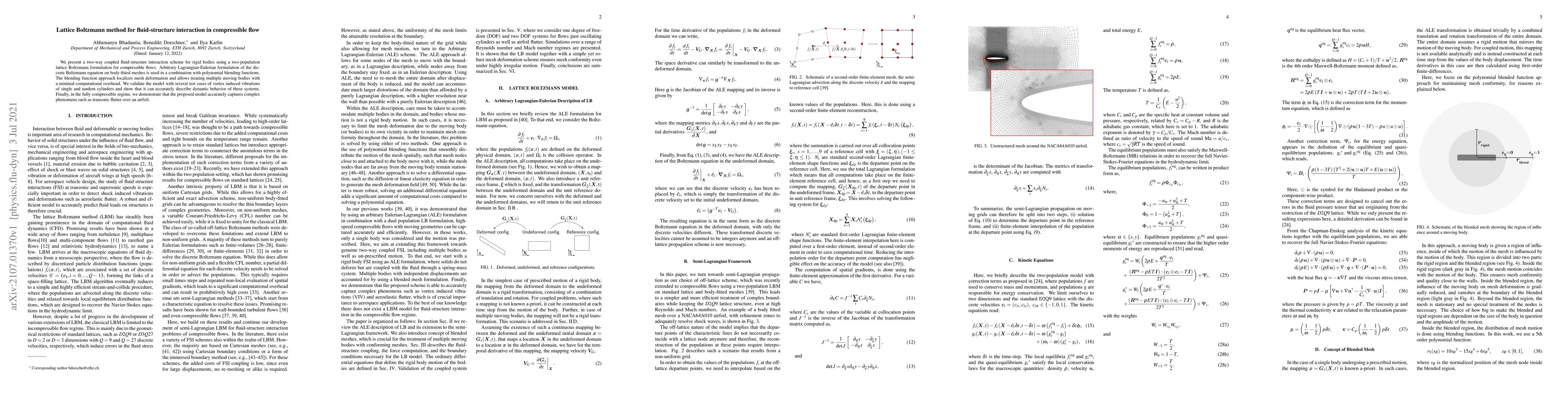 This paper introduces a two-way coupled fluid-structure interaction scheme using lattice Boltzmann for compressible flows, validated through vortex-induced vibrations and transonic flutter simulations, demonstrating accurate dynamic behavior and complex phenomena. The model employs a two-population lattice Boltzmann method with localized mesh deformation via polynomial blending functions.