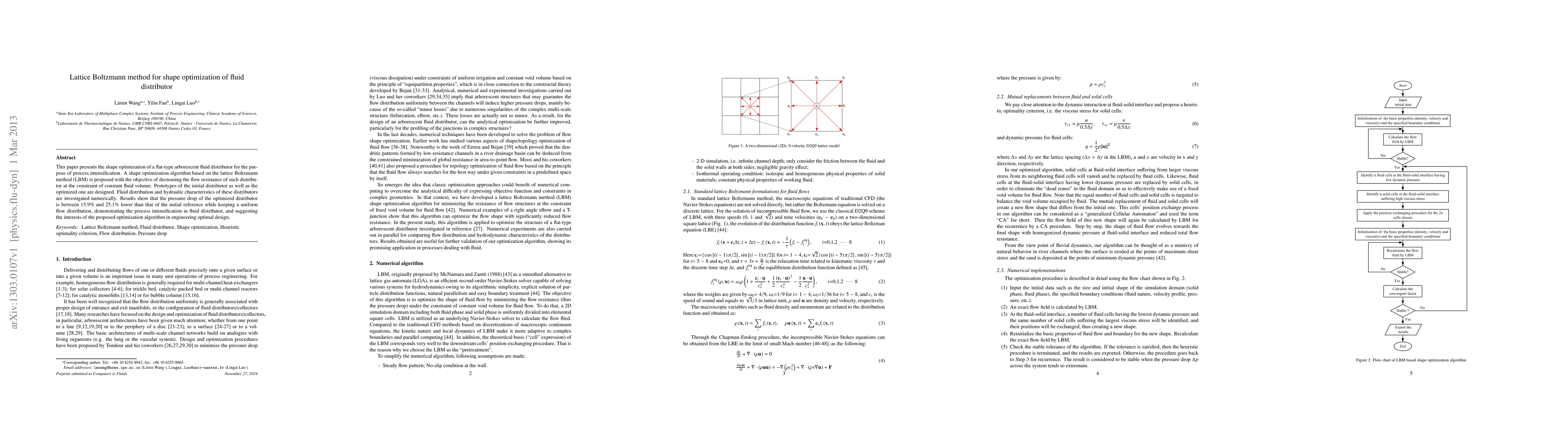 This paper proposes a lattice Boltzmann method (LBM) based shape optimization algorithm to reduce the flow resistance of a flat-type fluid distributor, achieving a 15.9% to 25.1% reduction in pressure drop while maintaining uniform flow distribution, thus demonstrating process intensification.