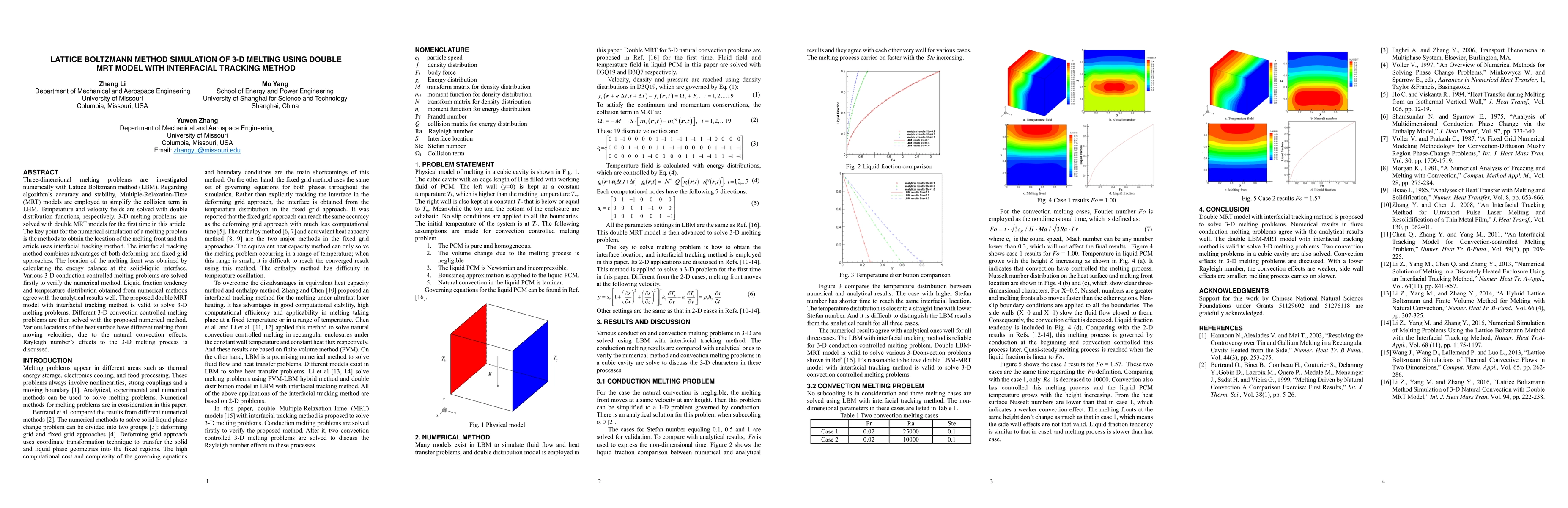 This paper investigates 3-D melting numerically using the Lattice Boltzmann Method (LBM) with a Double MRT model for enhanced accuracy and stability. It introduces an interfacial tracking method to accurately determine the melting front, combining the benefits of deforming and fixed grid approaches. The proposed method is validated through conduction-controlled melting simulations, showing good agreement with analytical results, and further applied to convection-controlled scenarios to analyze the impact of Rayleigh number on melting front dynamics.