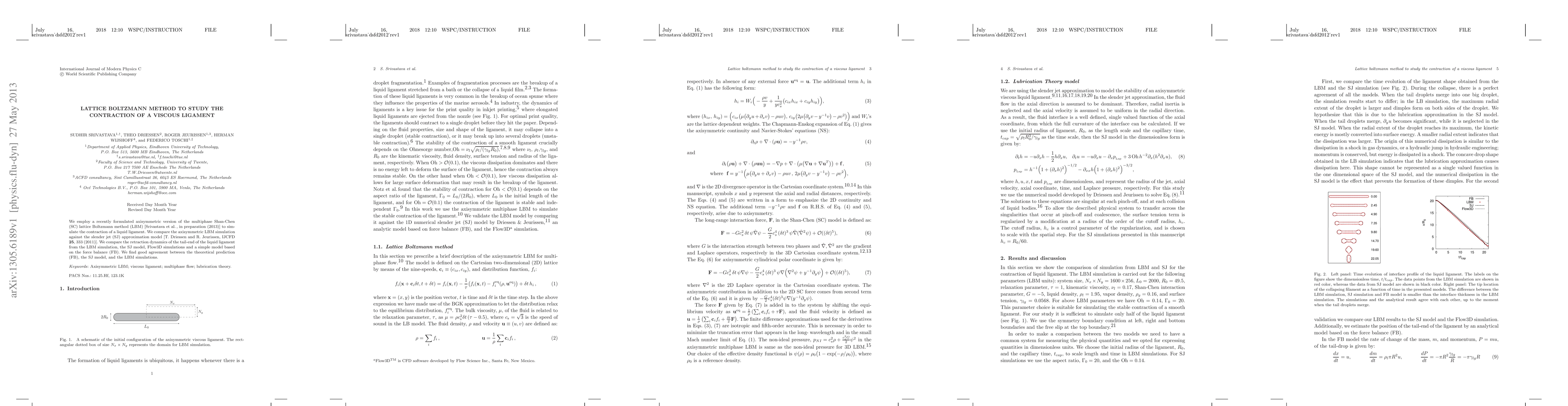 This paper uses an axisymmetric Shan-Chen lattice Boltzmann method to simulate the contraction of a liquid ligament, comparing its results with the slender jet model, Flow3D simulations, and a force balance model, finding good agreement among them.