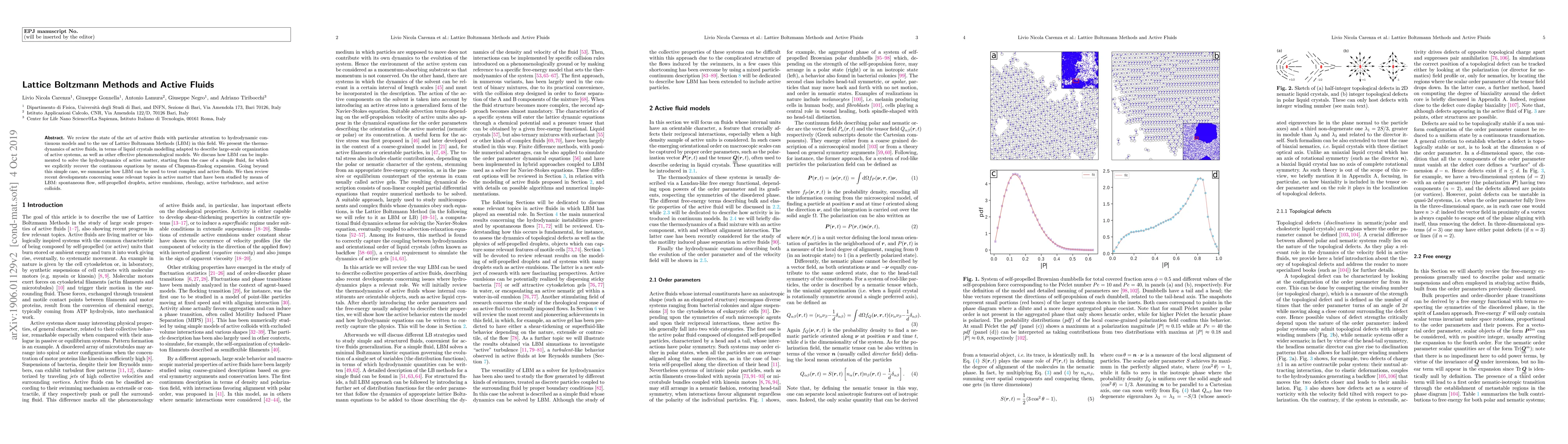 This paper reviews the application of Lattice Boltzmann Methods (LBM) to model active fluids, focusing on their hydrodynamics and thermodynamics. It discusses the use of LBM to simulate complex active matter phenomena such as spontaneous flow, self-propelled droplets, and active turbulence.