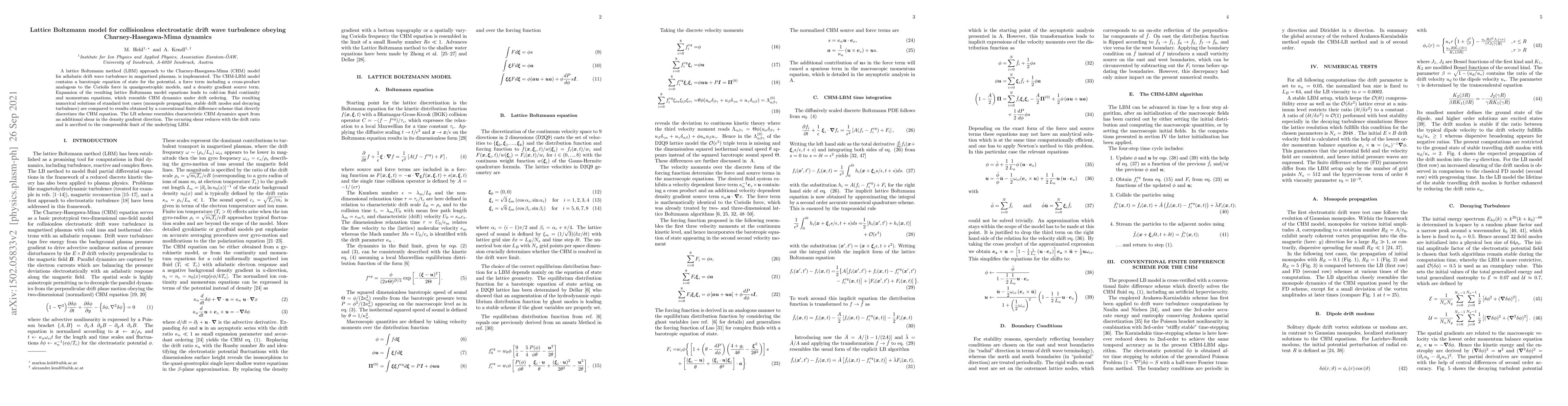 The paper presents a lattice Boltzmann method (LBM) for simulating Charney-Hasegawa-Mima (CHM) model dynamics in magnetized plasmas, showing that the LBM approach captures CHM dynamics well, with minor shear in density gradients due to the compressible limit of LBM. Comparisons with a finite difference method validate the LBM's effectiveness.