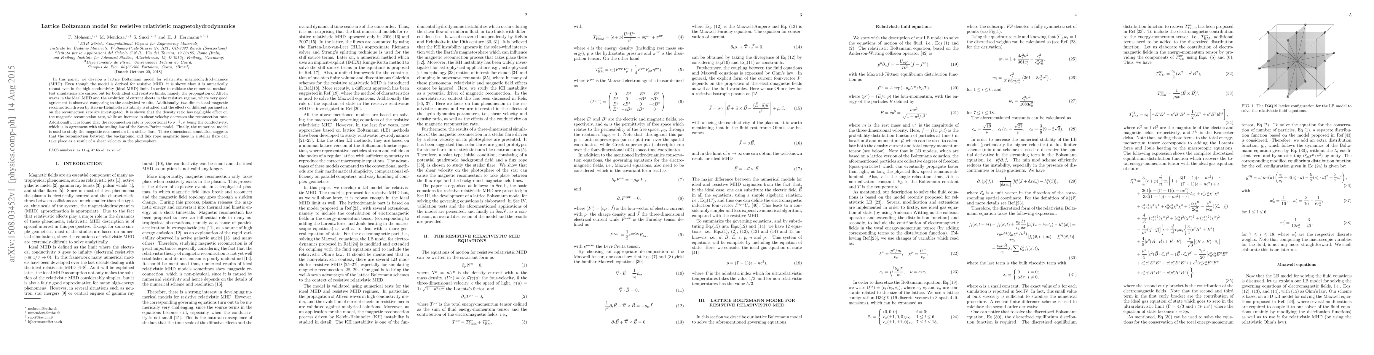 In this paper, we develop a lattice Boltzmann model for relativistic magnetohydrodynamics (MHD). Even though the model is derived for resistive MHD, it is shown that it is numerically robust even in the high conductivity (ideal MHD) limit. In order to validate the numerical method, test simulations are carried out for both ideal and resistive limits, namely the propagation of Alfv\'en waves in the ideal MHD and the evolution of current sheets in the resistive regime, where very good agreement is observed comparing to the analytical results. Additionally, two-dimensional magnetic reconnection driven by Kelvin-Helmholtz instability is studied and the effects of different parameters on the reconnection rate are investigated. It is shown that the density ratio has negligible effect on the magnetic reconnection rate, while an increase in shear velocity decreases the reconnection rate. Additionally, it is found that the reconnection rate is proportional to $\sigma^{-\frac{1}{2}}$, $\sigma$ being the conductivity, which is in agreement with the scaling law of the Sweet-Parker model. Finally, the numerical model is used to study the magnetic reconnection in a stellar flare. Three-dimensional simulation suggests that the reconnection between the background and flux rope magnetic lines in a stellar flare can take place as a result of a shear velocity in the photosphere.