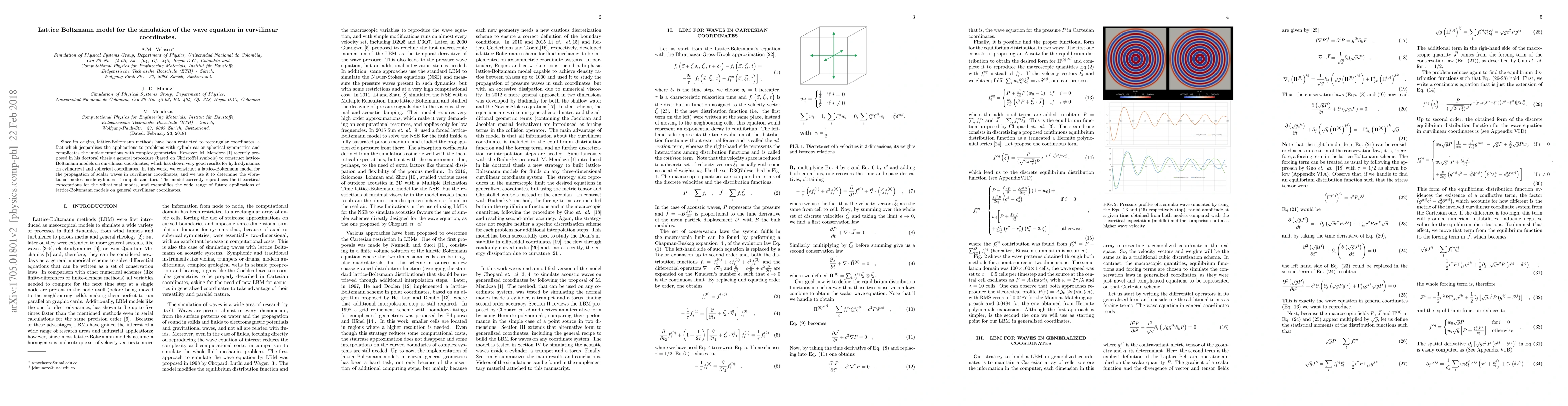 This paper develops a lattice-Boltzmann model for simulating wave propagation in curvilinear coordinates, extending previous methods to complex geometries. The model accurately determines vibrational modes in cylinders, trumpets, and tori, demonstrating its potential for diverse applications.