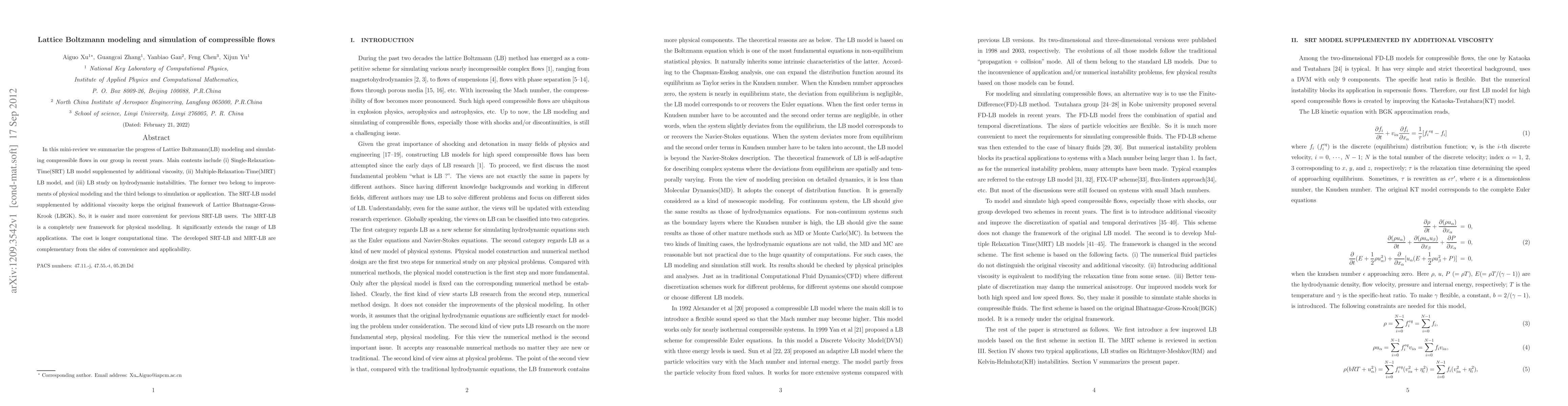 In this mini-review we summarize the progress of Lattice Boltzmann(LB) modeling and simulating compressible flows in our group in recent years. Main contents include (i) Single-Relaxation-Time(SRT) LB model supplemented by additional viscosity, (ii) Multiple-Relaxation-Time(MRT) LB model, and (iii) LB study on hydrodynamic instabilities. The former two belong to improvements of physical modeling and the third belongs to simulation or application. The SRT-LB model supplemented by additional viscosity keeps the original framework of Lattice Bhatnagar-Gross-Krook (LBGK). So, it is easier and more convenient for previous SRT-LB users. The MRT-LB is a completely new framework for physical modeling. It significantly extends the range of LB applications. The cost is longer computational time. The developed SRT-LB and MRT-LB are complementary from the sides of convenience and applicability.