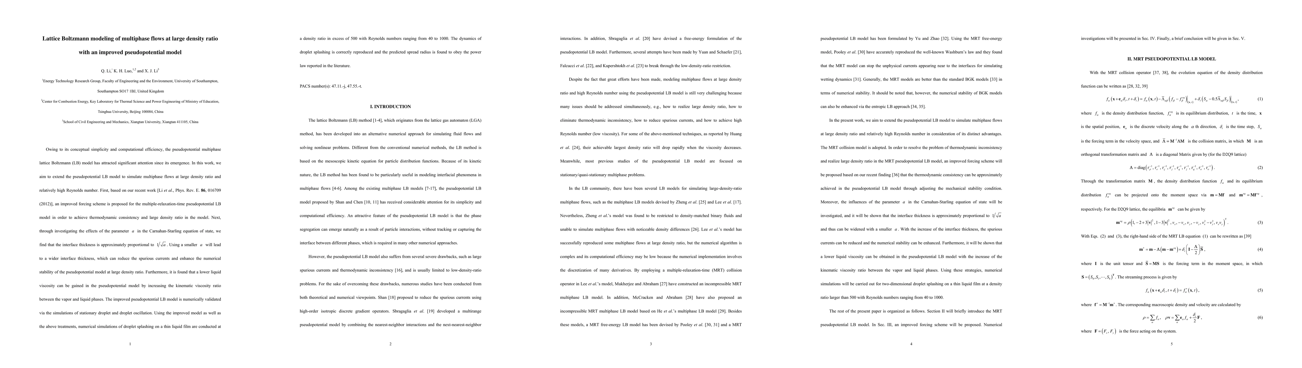 The paper introduces an improved forcing scheme for the MRT pseudopotential LB model, enabling accurate simulation of multiphase flows at large density ratios and high Reynolds numbers.