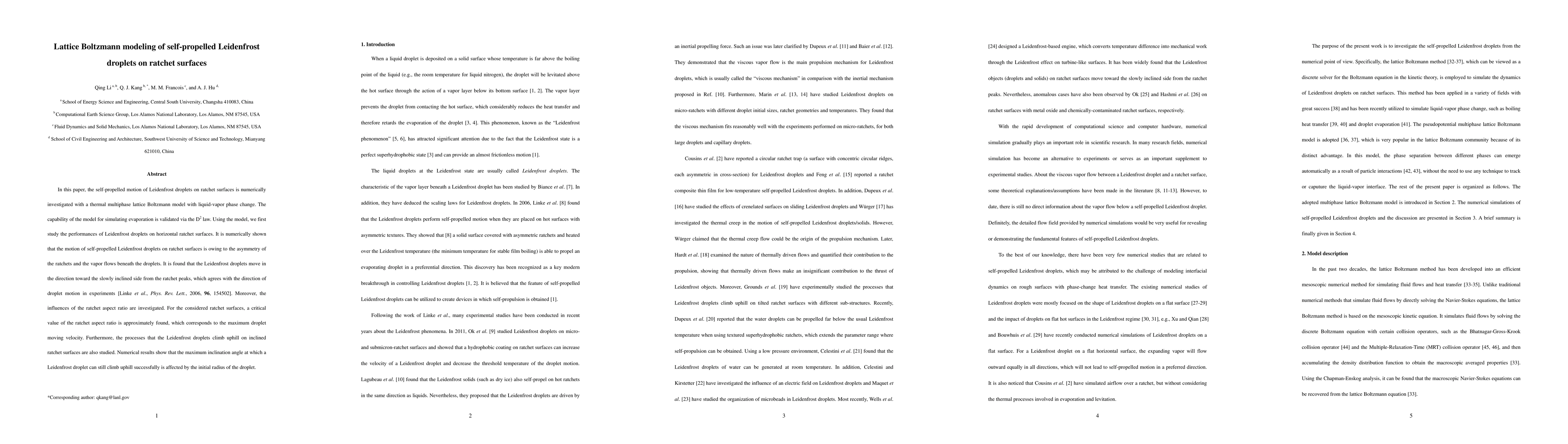 This research uses a thermal multiphase lattice Boltzmann model to simulate self-propelled Leidenfrost droplets on ratchet surfaces, demonstrating that droplet motion is driven by ratchet asymmetry and vapor flows. The model finds a critical ratchet aspect ratio for maximum droplet velocity and shows how droplet climbability on inclined surfaces depends on initial radius.