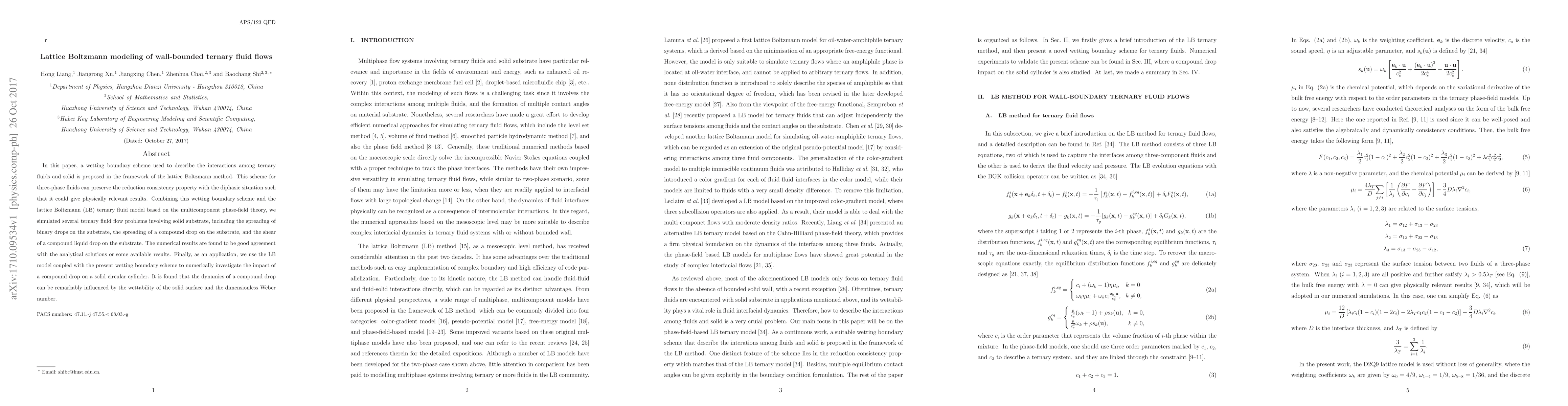 In this paper, a wetting boundary scheme used to describe the interactions among ternary fluids and solid is proposed in the framework of the lattice Boltzmann method. This scheme for three-phase fluids can preserve the reduction consistency property with the diphasic situation such that it could give physically relevant results. Combining this wetting boundary scheme and the lattice Boltzmann (LB) ternary fluid model based on the multicomponent phase-field theory, we simulated several ternary fluid flow problems involving solid substrate, including the spreading of binary drops on the substrate, the spreading of a compound drop on the substrate, and the shear of a compound liquid drop on the substrate. The numerical results are found to be good agreement with the analytical solutions or some available results. Finally, as an application, we use the LB model coupled with the present wetting boundary scheme to numerically investigate the impact of a compound drop on a solid circular cylinder. It is found that the dynamics of a compound drop can be remarkably influenced by the wettability of the solid surface and the dimensionless Weber number.