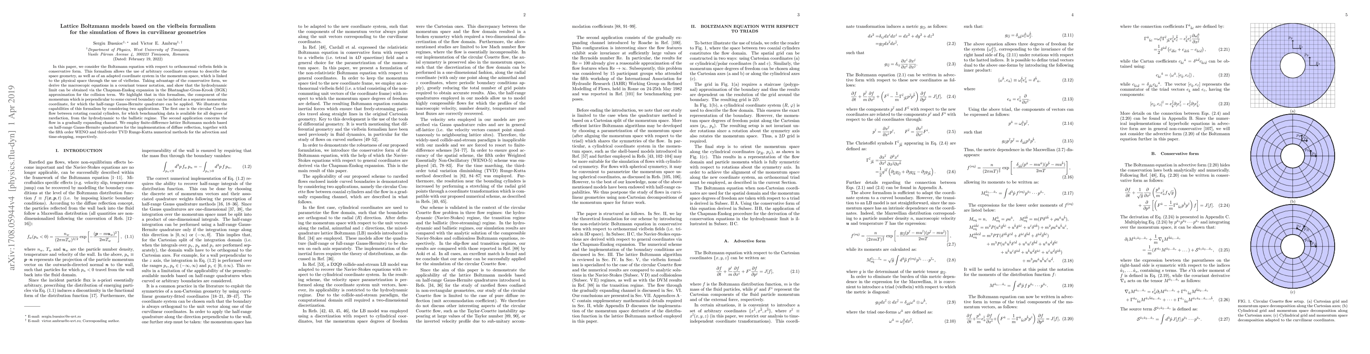 In this paper, we consider the Boltzmann equation with respect to orthonormal vielbein fields in conservative form. This formalism allows the use of arbitrary coordinate systems to describe the space geometry, as well as of an adapted coordinate system in the momentum space, which is linked to the physical space through the use of vielbeins. Taking advantage of the conservative form, we derive the macroscopic equations in a covariant tensor notation, and show that the hydrodynamic limit can be obtained via the Chapman-Enskog expansion in the Bhatnaghar-Gross-Krook (BGK) approximation for the collision term. We highlight that in this formalism, the component of the momentum which is perpendicular to some curved boundary can be isolated as a separate momentum coordinate, for which the half-range Gauss-Hermite quadrature can be applied. We illustrate the capabilities of this formalism by considering two applications. The first one is the circular Couette flow between rotating coaxial cylinders, for which benchmarking data is available for all degrees of rarefaction, from the hydrodynamic to the ballistic regime. The second application concerns the flow in a gradually expanding channel. We employ finite-difference lattice Boltzmann models based on half-range Gauss-Hermite quadratures for the implementation of diffuse reflection, together with the fifth order WENO and third-order TVD Runge-Kutta numerical methods for the advection and time-stepping, respectively.