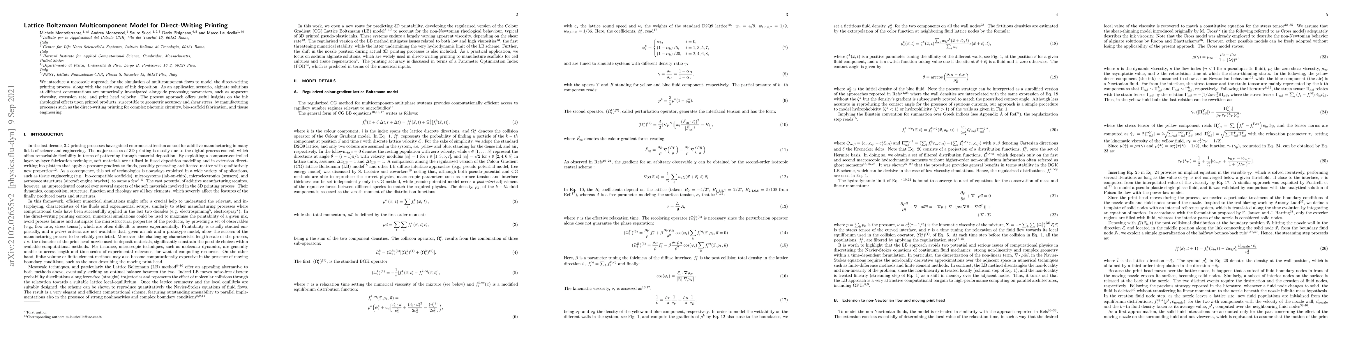 We introduce a mesoscale approach for the simulation of multicomponent flows to model the direct-writing printing process, along with the early stage of ink deposition. As an application scenario, alginate solutions at different concentrations are numerically investigated alongside processing parameters, such as apparent viscosity, extrusion rate, and print head velocity. The present approach offers useful insights on the ink rheological effects upon printed products, susceptible to geometric accuracy and shear stress, by manufacturing processes such as the direct-writing printing for complex photonic circuitry, bio-scaffold fabrication, and tissue engineering.
