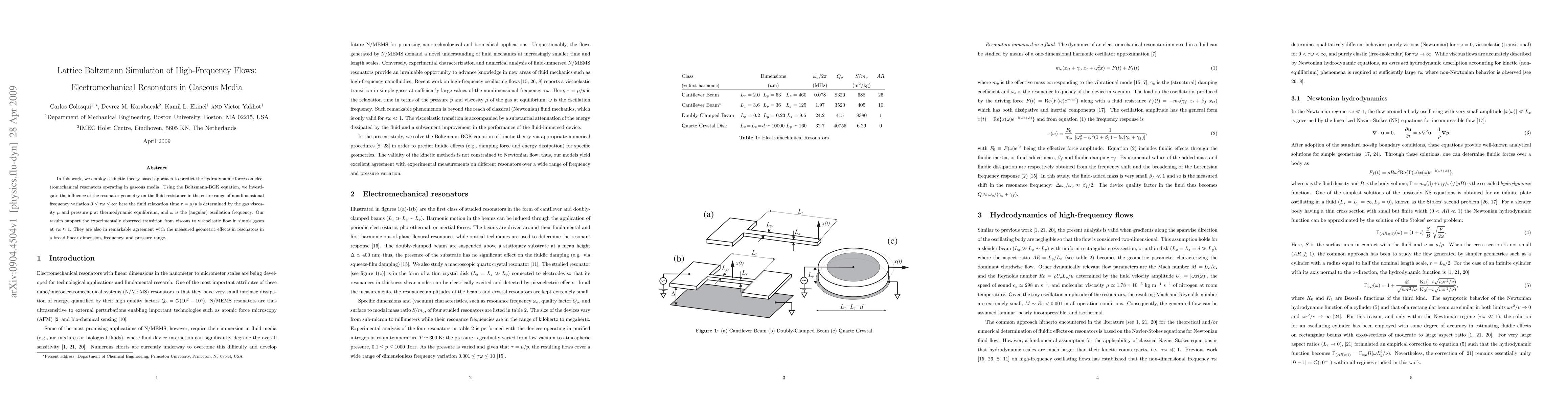 This paper uses the lattice Boltzmann method to simulate high-frequency flows around electromechanical resonators in gaseous media, revealing the transition from viscous to viscoelastic flow at $\tau\omega\approx1$ and validating geometric effects across various dimensions and frequencies.