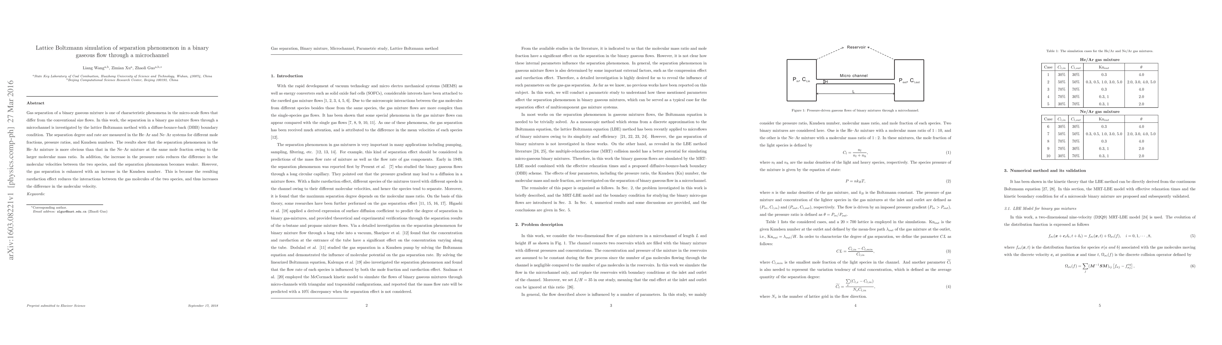 Researchers used lattice Boltzmann method to study separation of binary gas mixtures in microchannels, finding that separation is more pronounced in He--Ar mixtures due to molecular mass ratio, and is enhanced by higher Knudsen numbers.