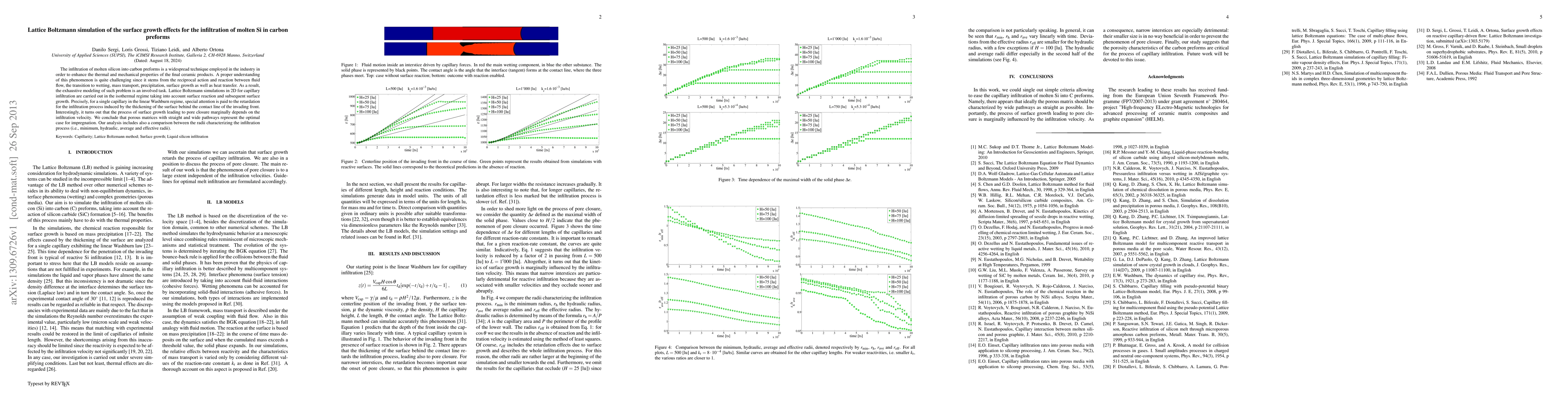 The infiltration of molten silicon into carbon preforms is a widespread technique employed in the industry in order to enhance the thermal and mechanical properties of the final ceramic products. A proper understanding of this phenomenon is quite challenging since it stems from the reciprocal action and reaction between fluid flow, the transition to wetting, mass transport, precipitation, surface growth as well as heat transfer. As a result, the exhaustive modeling of such problem is an involved task. Lattice Boltzmann simulations in 2D for capillary infiltration are carried out in the isothermal regime taking into account surface reaction and subsequent surface growth. Precisely, for a single capillary in the linear Washburn regime, special attention is paid to the retardation for the infiltration process induced by the thickening of the surface behind the contact line of the invading front. Interestingly, it turns out that the process of surface growth leading to pore closure marginally depends on the infiltration velocity. We conclude that porous matrices with straight and wide pathways represent the optimal case for impregnation. Our analysis includes also a comparison between the radii characterizing the infiltration process (i.e., minimum, hydraulic, average and effective radii).