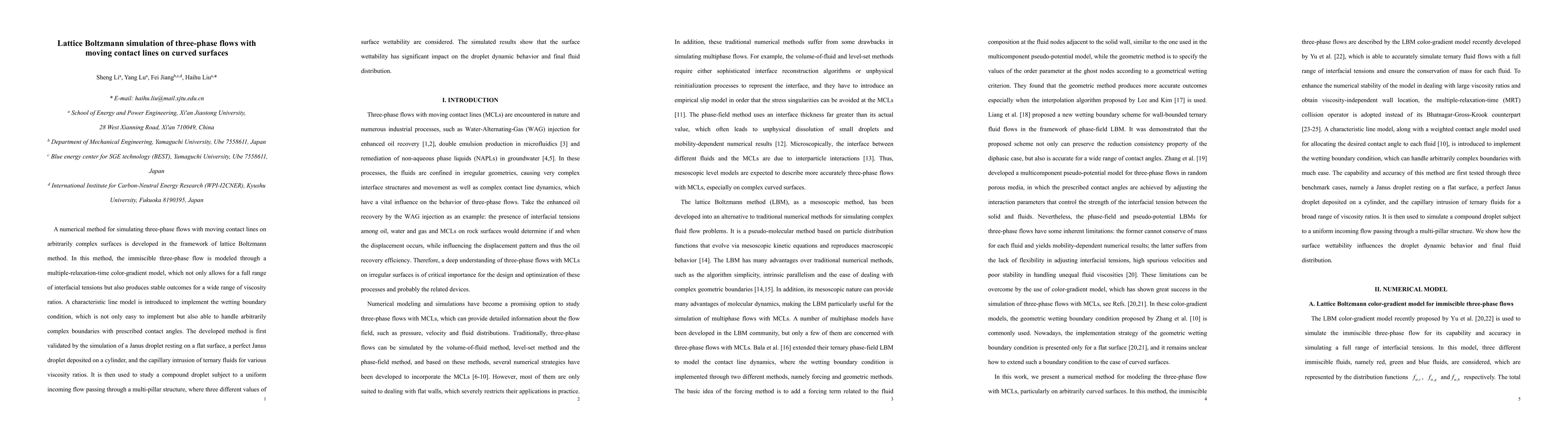 This paper presents a lattice Boltzmann method for simulating three-phase flows with moving contact lines on complex surfaces. The method employs a color-gradient model for interfacial tension and a characteristic line model for wetting boundary conditions, validated through various scenarios including droplet behavior on curved surfaces.