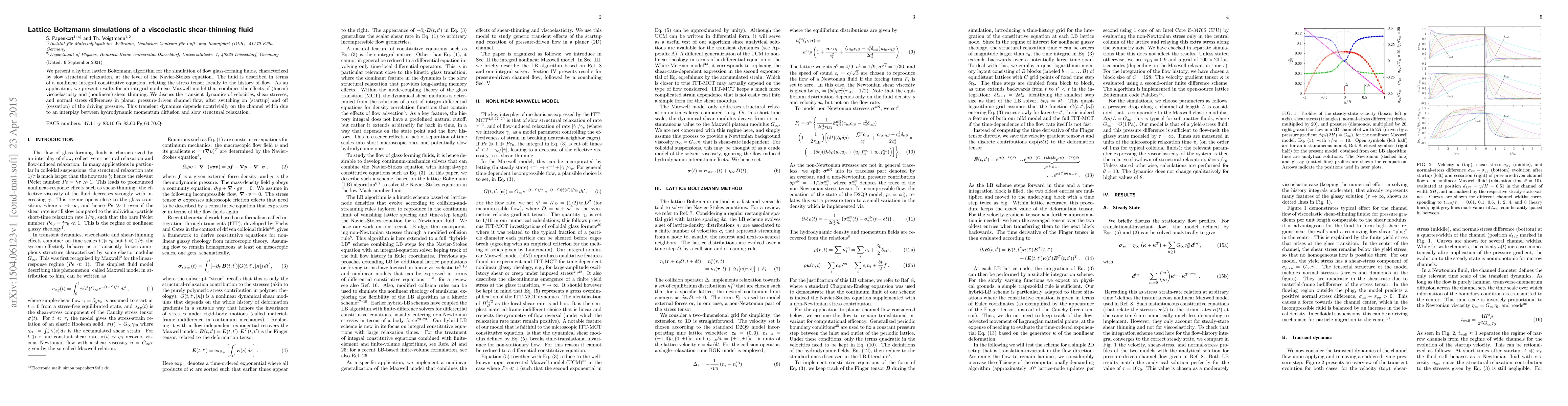 We present a hybrid lattice Boltzmann algorithm for the simulation of flow glass-forming fluids, characterized by slow structural relaxation, at the level of the Navier-Stokes equation. The fluid is described in terms of a nonlinear integral constitutive equation, relating the stress tensor locally to the history of flow. As an application, we present results for an integral nonlinear Maxwell model that combines the effects of (linear) viscoelasticity and (nonlinear) shear thinning. We discuss the transient dynamics of velocities, shear stresses, and normal stress differences in planar pressure-driven channel flow, after switching on (startup) and off (cessation) of the driving pressure. This transient dynamics depends nontrivially on the channel width due to an interplay between hydrodynamic momentum diffusion and slow structural relaxation.
