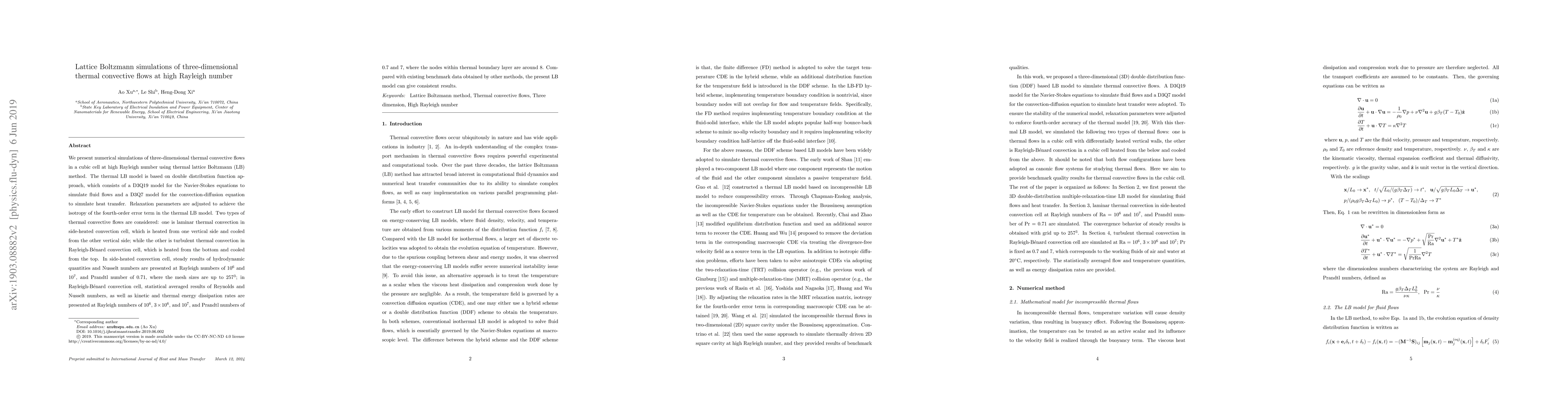 This paper uses thermal lattice Boltzmann simulations to study three-dimensional thermal convective flows at high Rayleigh numbers, employing a double distribution function approach. It examines both laminar and turbulent convection in different geometries, achieving consistent results with benchmark data.