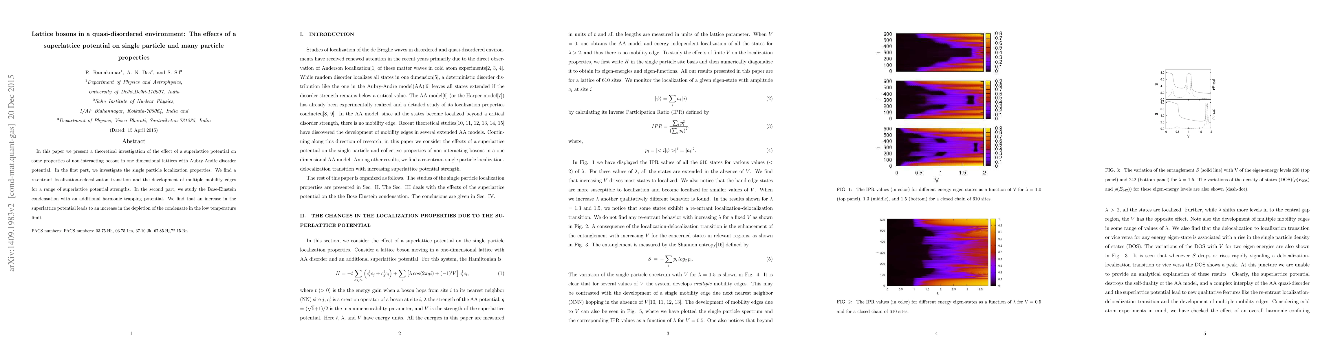 In this paper we present a theoretical investigation of the effect of a superlattice potential on some properties of non-interacting bosons in one dimensional lattices with Aubry-And\'re disorder potential. In the first part, we investigate the single particle localization properties. We find a re-entrant localization-delocalization transition and the development of multiple mobility edges for a range of superlattice potential strengths. In the second part, we study the Bose-Einstein condensation with an additional harmonic trapping potential. We find that an increase in the superlattice potential leads to an increase in the depletion of the condensate in the low temperature limit.