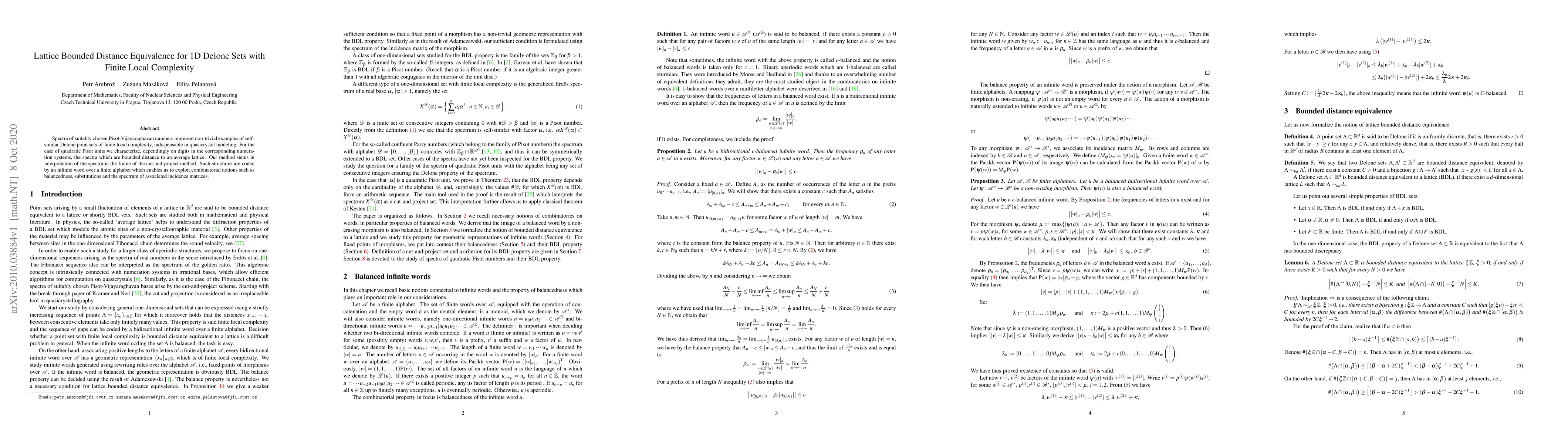 Spectra of suitably chosen Pisot-Vijayaraghavan numbers represent non-trivial examples of self-similar Delone point sets of finite local complexity, indispensable in quasicrystal modeling. For the case of quadratic Pisot units we characterize, dependingly on digits in the corresponding numeration systems, the spectra which are bounded distance to an average lattice. Our method stems in interpretation of the spectra in the frame of the cut-and-project method. Such structures are coded by an infinite word over a finite alphabet which enables us to exploit combinatorial notions such as balancedness, substitutions and the spectrum of associated incidence matrices.