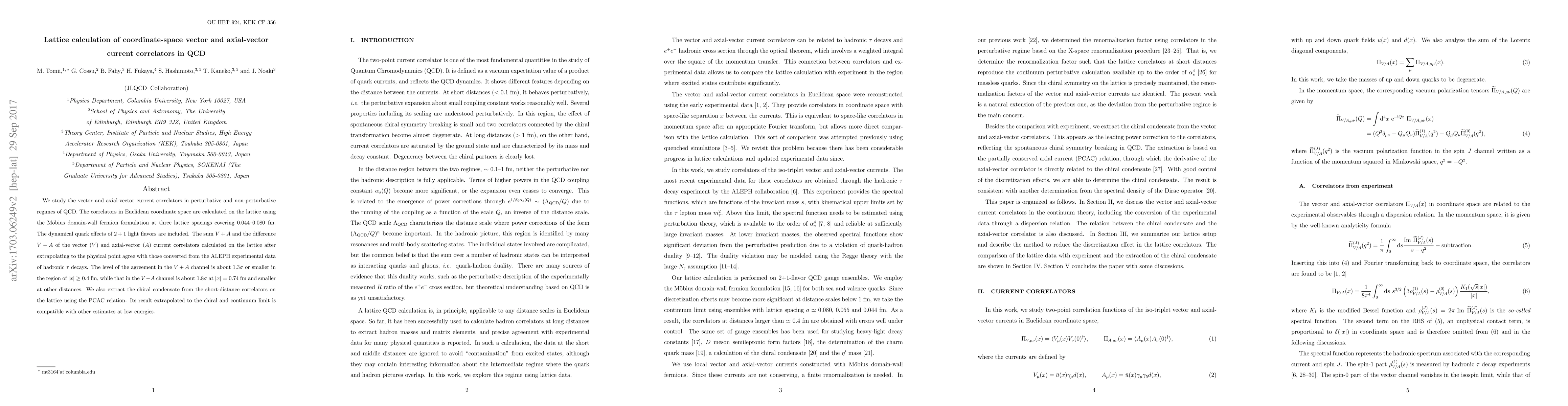 This paper presents lattice QCD calculations of vector and axial-vector current correlators using the M\"obius domain-wall fermion formulation, showing agreement with experimental data from ALEPH. The study also extracts the chiral condensate from lattice data, which is consistent with other low-energy estimates.