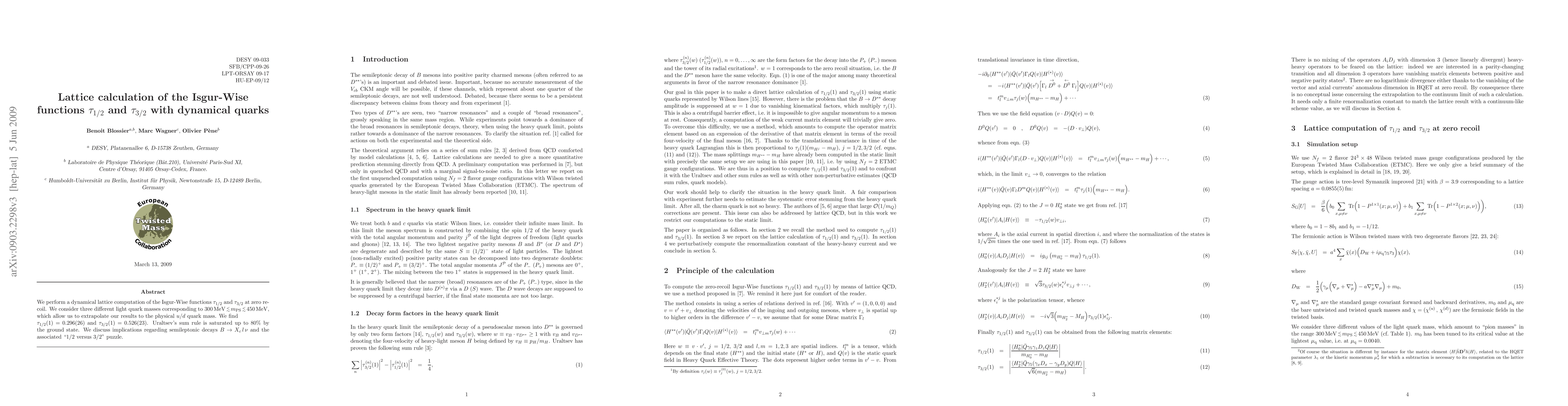 We perform a dynamical lattice computation of the Isgur-Wise functions tau_{1/2} and tau_{3/2} at zero recoil. We consider three different light quark masses corresponding to 300 MeV < m_{PS} < 450 MeV, which allow us to extrapolate our results to the physical u/d quark mass. We find tau_{1/2}(1) = 0.296(26) and tau_{3/2}(1) = 0.526(23). Uraltsev's sum rule is saturated up to 80% by the ground state. We discuss implications regarding semileptonic decays B --> X_c l nu and the associated "1/2 versus 3/2" puzzle.