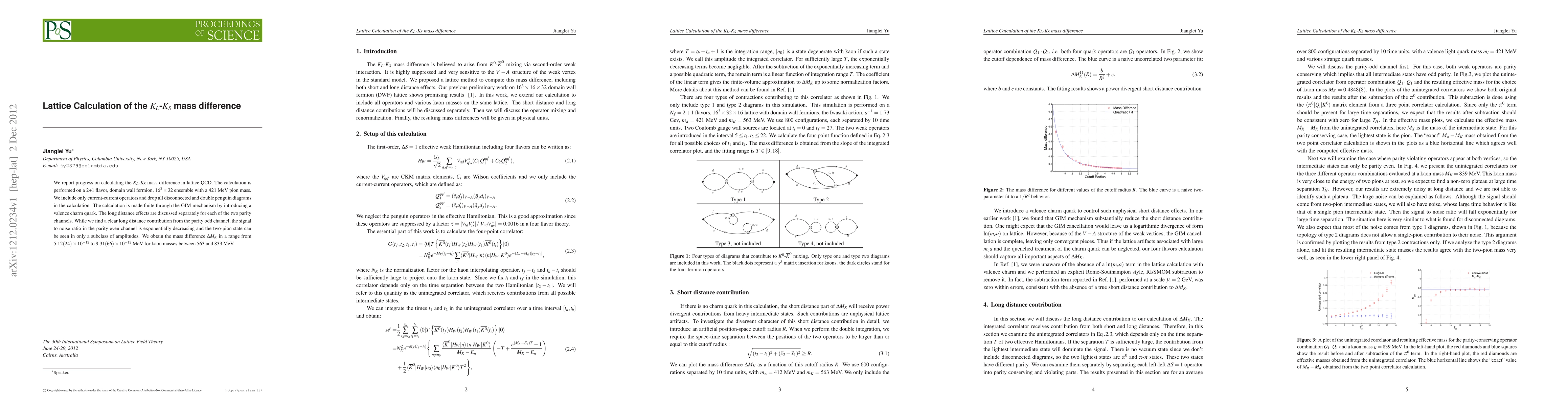 We report progress on calculating the $K_L$-$K_S$ mass difference in lattice QCD. T he calculation is performed on a 2+1 flavor, domain wall fermion, $16^3\times 32$ en semble with a 421 MeV pion mass. We include only current-current operators and drop all disconnected and double penguin diagrams in the calculation. The calculation is made finite through the GIM mechanism by introducing a valence charm quark. The long distance effects are discussed separately for each of the two parity channels. Whil e we find a clear long distance contribution from the parity odd channel, the signal to noise ratio in the parity even channel is exponentially decreasing and the two-p ion state can be seen in only a subclass of amplitudes. We obtain the mass differenc e $\Delta M_K$ in a range from $5.12(24)\times 10^{-12}$ to $9.31(66) \times 10^{-12}$ MeV for kaon masses between 563 and 839 MeV.