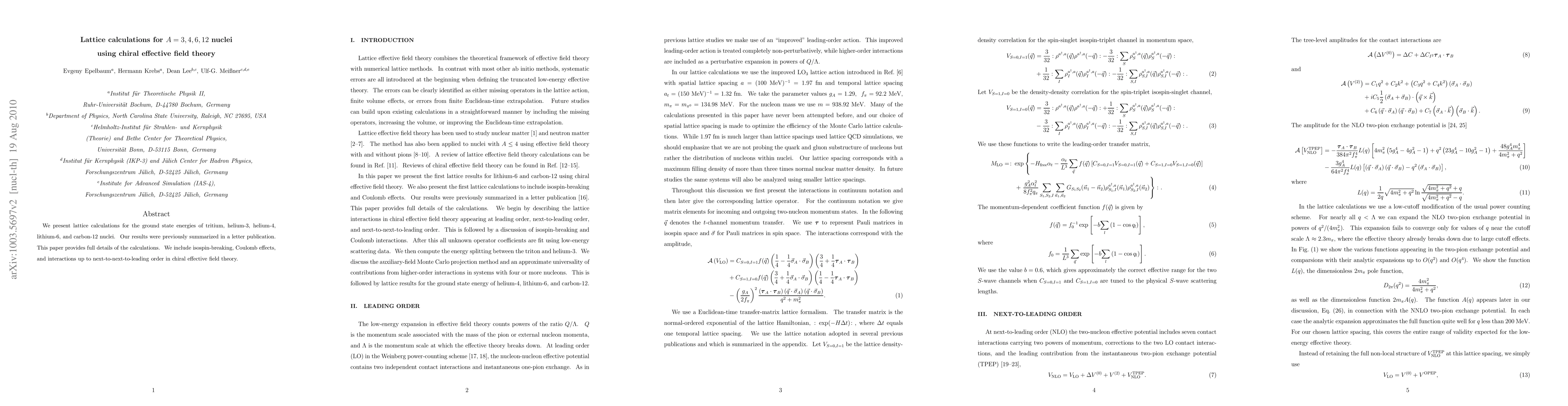 This paper details lattice calculations for ground state energies of A=3,4,6,12 nuclei using chiral effective field theory, including isospin-breaking, Coulomb effects, and interactions up to next-to-next-to-leading order. Full results for tritium, helium-3, helium-4, lithium-6, and carbon-12 are presented.