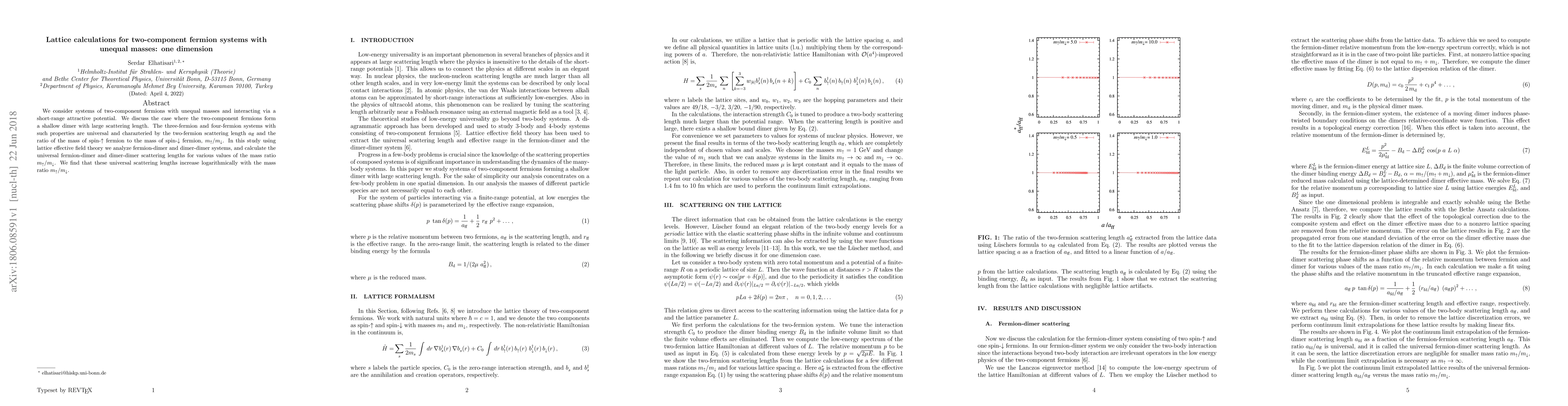 This paper uses lattice effective field theory to study two-component fermion systems with unequal masses interacting via a short-range potential, focusing on shallow dimers. It finds that the universal fermion-dimer and dimer-dimer scattering lengths increase logarithmically with the mass ratio of the fermions.