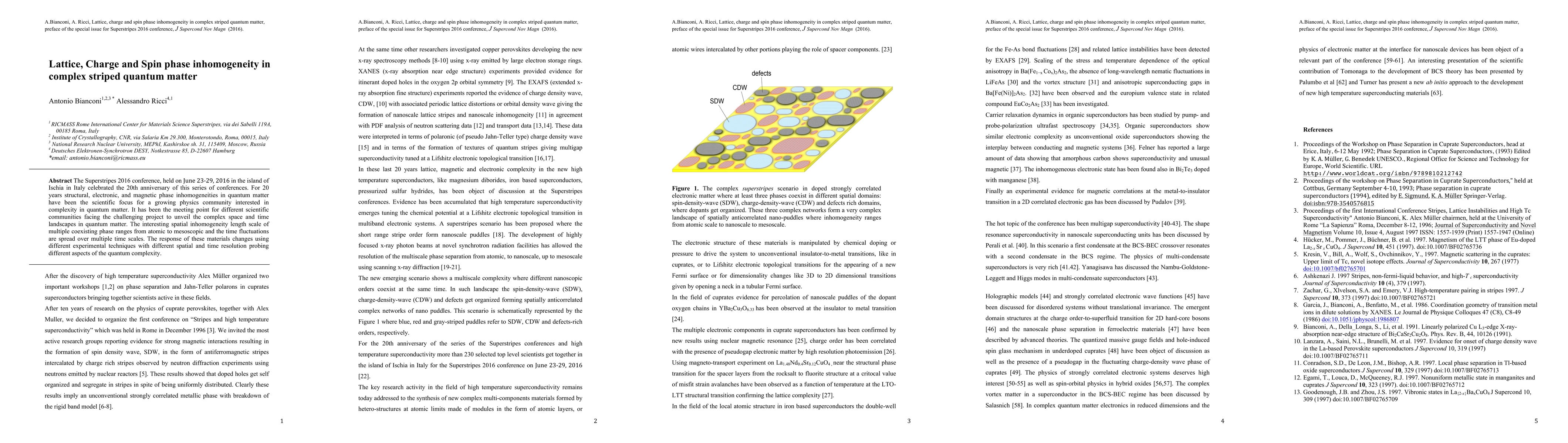 The Superstripes 2016 conference marked 20 years of research into complex quantum matter, focusing on inhomogeneities in lattice, charge, and spin. The study explores spatial and temporal quantum complexity across various scales, using diverse experimental techniques to probe these intricate phenomena.