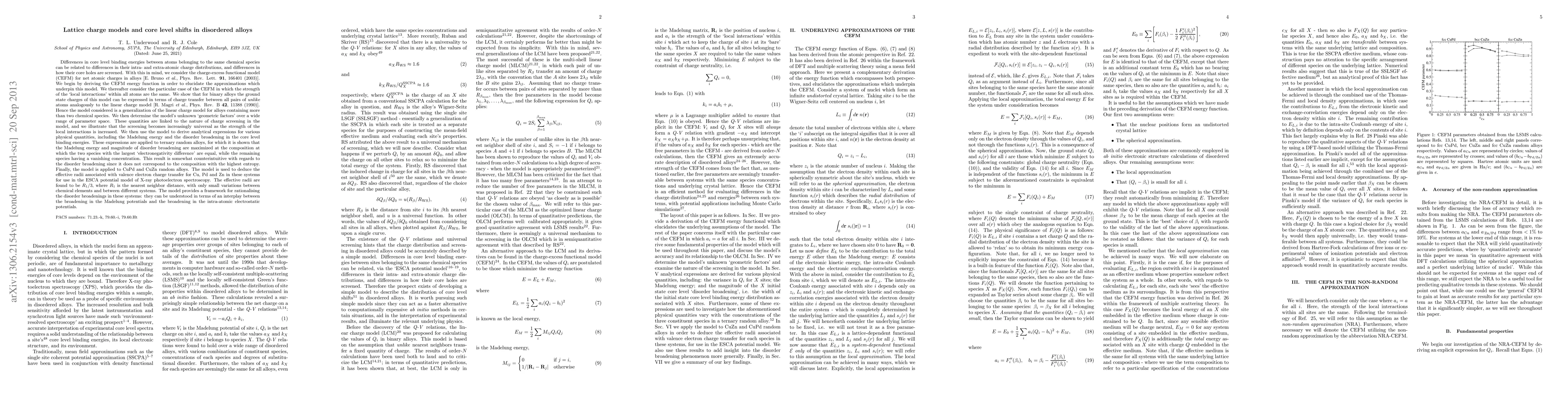 This paper derives the charge-excess functional model (CEFM) for net atomic charges in disordered alloys, showing that it generalizes the linear charge model for multi-species alloys. It determines the model's geometric factors and uses the model to derive analytical expressions for the Madelung energy and disorder broadening in core level binding energies, revealing counterintuitive results for ternary random alloys.