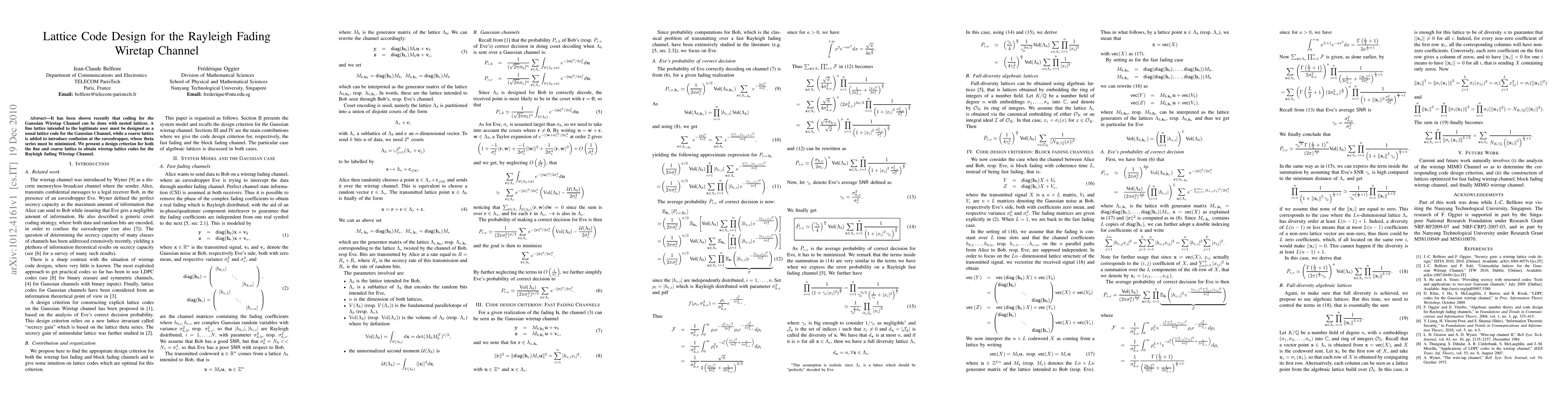This paper proposes a lattice code design for the Rayleigh fading wiretap channel using nested lattices, where a fine lattice targets the legitimate user and a coarse lattice confuses the eavesdropper. The design criterion aims to minimize the eavesdropper's theta series for optimal security.