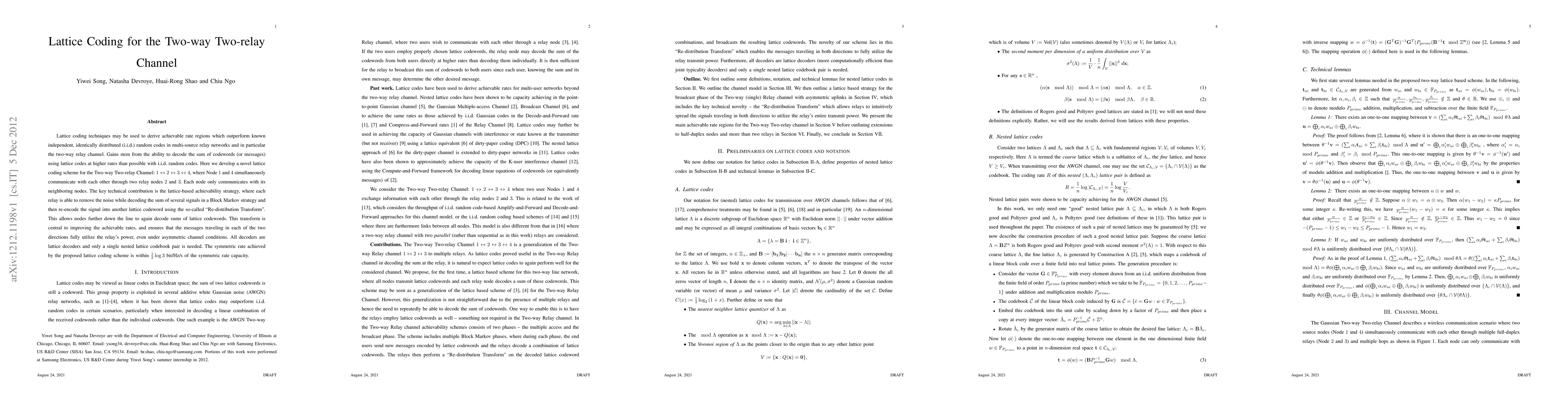 Lattice coding techniques may be used to derive achievable rate regions which outperform known independent, identically distributed (i.i.d.) random codes in multi-source relay networks and in particular the two-way relay channel. Gains stem from the ability to decode the sum of codewords (or messages) using lattice codes at higher rates than possible with i.i.d. random codes. Here we develop a novel lattice coding scheme for the Two-way Two-relay Channel: 1 <-> 2 <-> 3 <-> 4, where Node 1 and 4 simultaneously communicate with each other through two relay nodes 2 and 3. Each node only communicates with its neighboring nodes. The key technical contribution is the lattice-based achievability strategy, where each relay is able to remove the noise while decoding the sum of several signals in a Block Markov strategy and then re-encode the signal into another lattice codeword using the so-called "Re-distribution Transform". This allows nodes further down the line to again decode sums of lattice codewords. This transform is central to improving the achievable rates, and ensures that the messages traveling in each of the two directions fully utilize the relay's power, even under asymmetric channel conditions. All decoders are lattice decoders and only a single nested lattice codebook pair is needed. The symmetric rate achieved by the proposed lattice coding scheme is within 0.5 log 3 bit/Hz/s of the symmetric rate capacity.