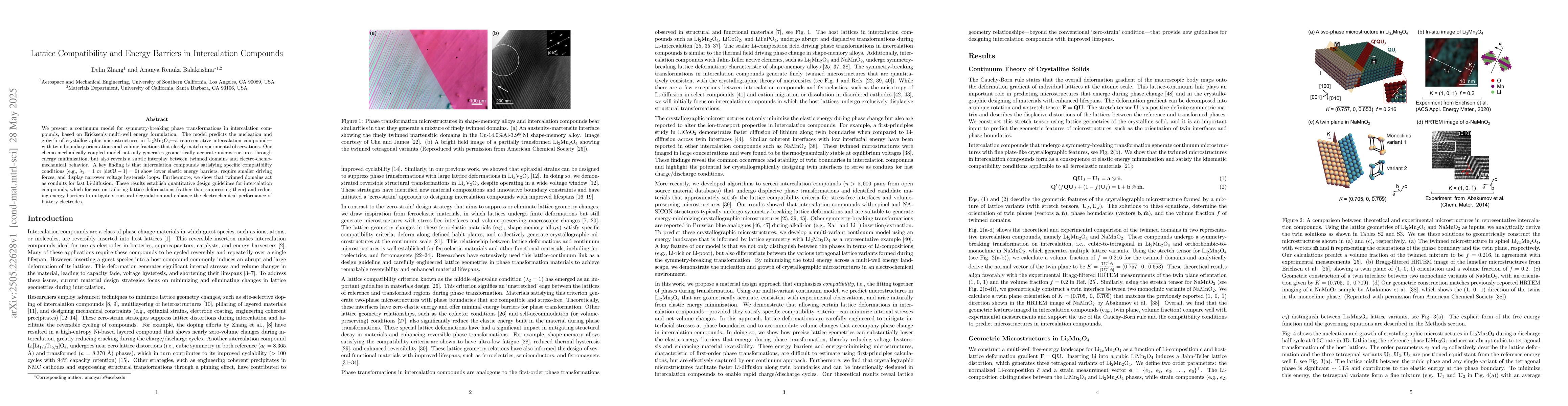 We present a continuum model for symmetry-breaking phase transformations in intercalation compounds, based on Ericksen's multi-well energy formulation. The model predicts the nucleation and growth of crystallographic microstructures in Li$_{2}$Mn$_{2}$O$_{4}$ -- a representative intercalation compound -- with twin boundary orientations and volume fractions that closely match experimental observations. Our chemo-mechanically coupled model not only generates geometrically accurate microstructures through energy minimization, but also reveals a subtle interplay between twinned domains and electro-chemo-mechanical behavior. A key finding is that intercalation compounds satisfying specific compatibility conditions (e.g., $\lambda_{2} = 1$ or $|\det \mathbf{U} - 1| = 0)$ show lower elastic energy barriers, require smaller driving forces, and display narrower voltage hysteresis loops. Furthermore, we show that twinned domains act as conduits for fast Li-diffusion. These results establish quantitative design guidelines for intercalation compounds, which focuses on tailoring lattice deformations (rather than suppressing them) and reducing energy barriers to mitigate structural degradation and enhance the electrochemical performance of battery electrodes.