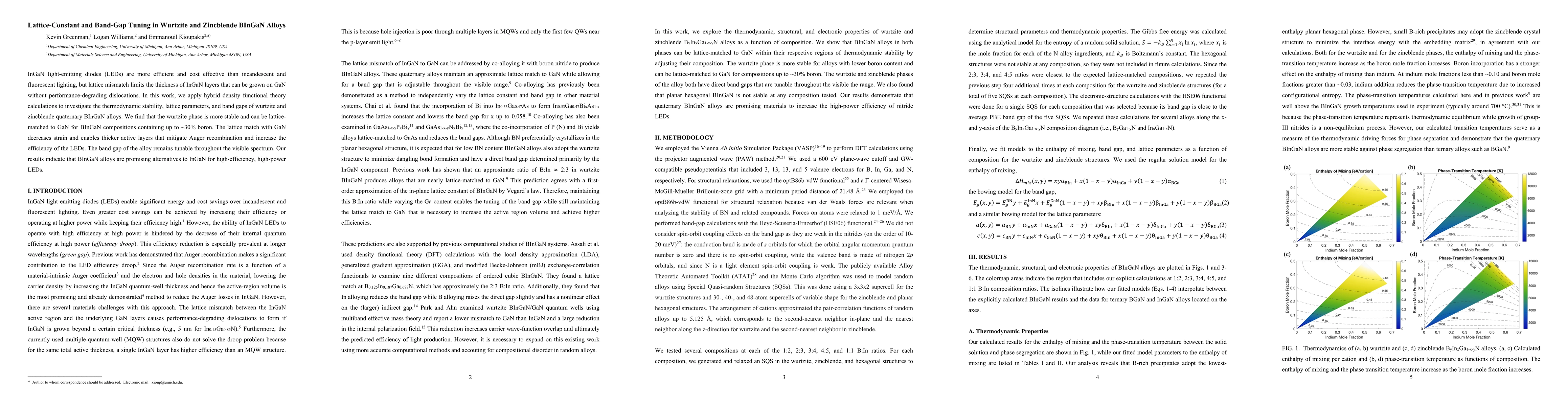 InGaN light-emitting diodes (LEDs) are more efficient and cost effective than incandescent and fluorescent lighting, but lattice mismatch limits the thickness of InGaN layers that can be grown on GaN without performance-degrading dislocations. In this work, we apply hybrid density functional theory calculations to investigate the thermodynamic stability, lattice parameters, and band gaps of wurtzite and zincblende quaternary BInGaN alloys. We find that the wurtzite phase is more stable and can be lattice-matched to GaN for BInGaN compositions containing up to ~30% boron. The lattice match with GaN decreases strain and enables thicker active layers that mitigate Auger recombination and increase the efficiency of the LEDs. The band gap of the alloy remains tunable throughout the visible spectrum. Our results indicate that BInGaN alloys are promising alternatives to InGaN for high-efficiency, high-power LEDs.