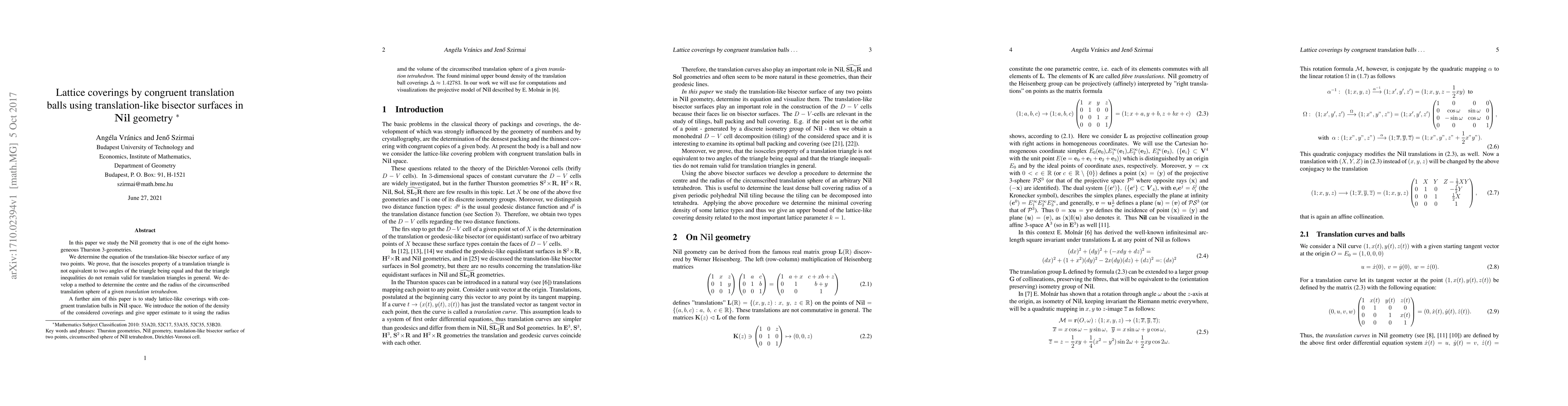 This paper explores Nil geometry, one of Thurston's eight homogeneous 3-geometries, focusing on translation-like bisector surfaces and translation triangles. It introduces a method for determining the circumscribed translation sphere of a translation tetrahedron and studies lattice-like coverings of Nil space by congruent translation balls, finding a minimal upper bound density of approximately 1.42783.