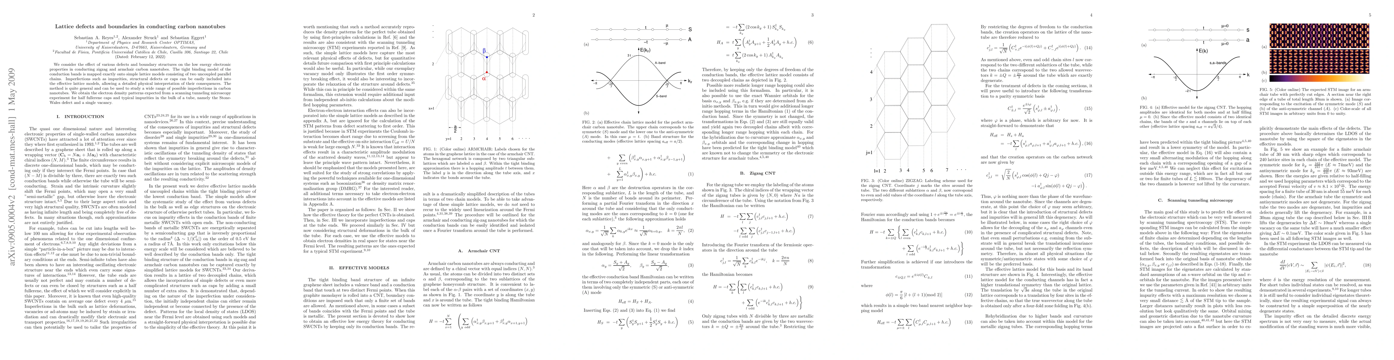 We consider the effect of various defects and boundary structures on the low energy electronic properties in conducting zigzag and armchair carbon nanotubes. The tight binding model of the conduction bands is mapped exactly onto simple lattice models consisting of two uncoupled parallel chains. Imperfections such as impurities, structural defects or caps can be easily included into the effective lattice models, allowing a detailed physical interpretation of their consequences. The method is quite general and can be used to study a wide range of possible imperfections in carbon nanotubes. We obtain the electron density patterns expected from a scanning tunneling microscopy experiment for half fullerene caps and two typical impurities in the bulk of a tube, namely the Stone-Wales defect and a single vacancy.