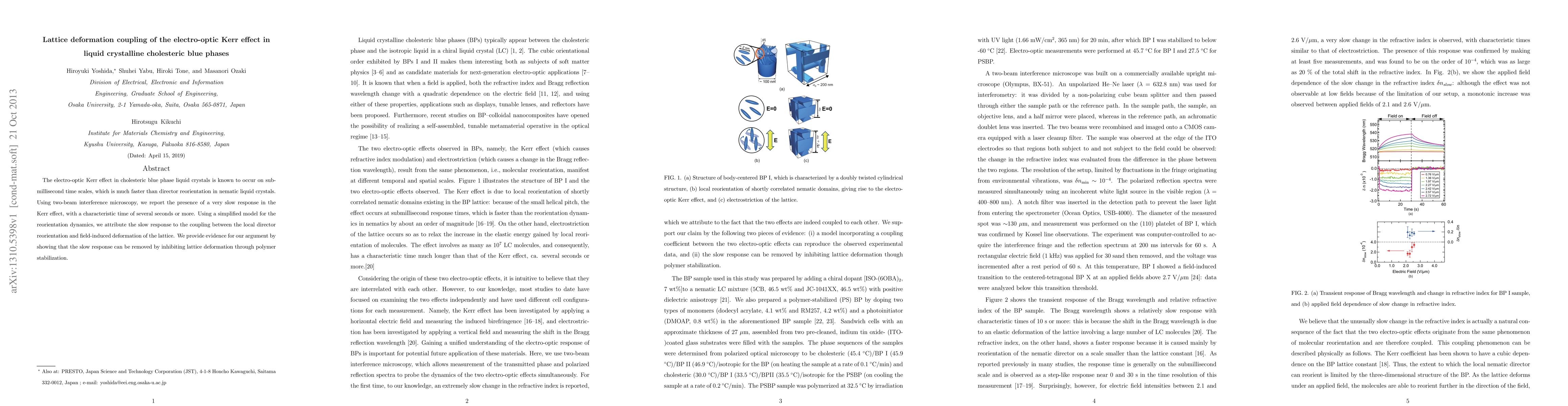 This paper investigates the electro-optic Kerr effect in cholesteric blue phase liquid crystals, revealing a slow response on the order of seconds due to lattice deformation coupling. The authors demonstrate that this slow response can be eliminated by stabilizing the lattice with polymers, supporting their model of reorientation dynamics.