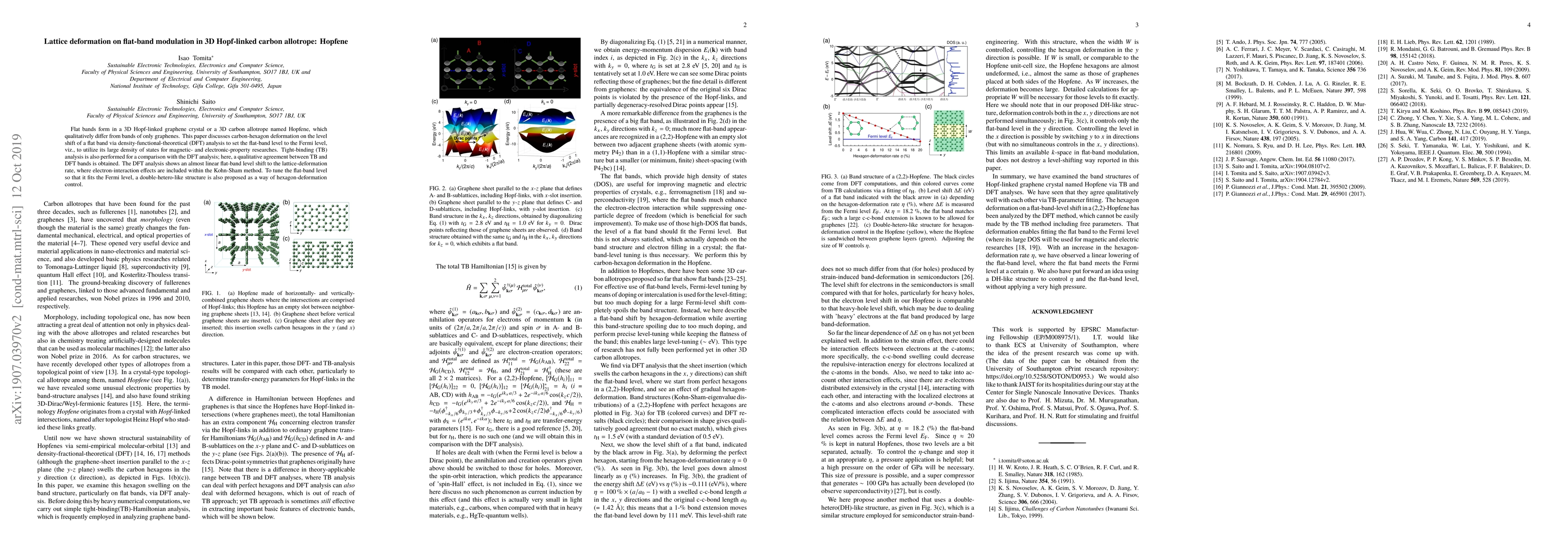 Flat bands form in a 3D Hopf-linked graphene crystal or a 3D carbon allotrope named Hopfene, which qualitatively differ from bands of only graphenes. This paper discusses carbon-hexagon deformation on the level shift of a flat band via density-functional-theoretical (DFT) analysis to set the flat-band level to the Fermi level, viz., to utilize its large density of states for magnetic- and electronic-property researches. Tight-binding (TB) analysis is also performed for a comparison with the DFT analysis; here, a qualitative agreement between TB and DFT bands is obtained. The DFT analysis shows an almost linear flat-band level shift to the lattice-deformation rate, where electron-interaction effects are included within the Kohn-Sham method. To tune the flat-band level so that it fits the Fermi level, a double-hetero-like structure is also proposed as a way of hexagon-deformation control.