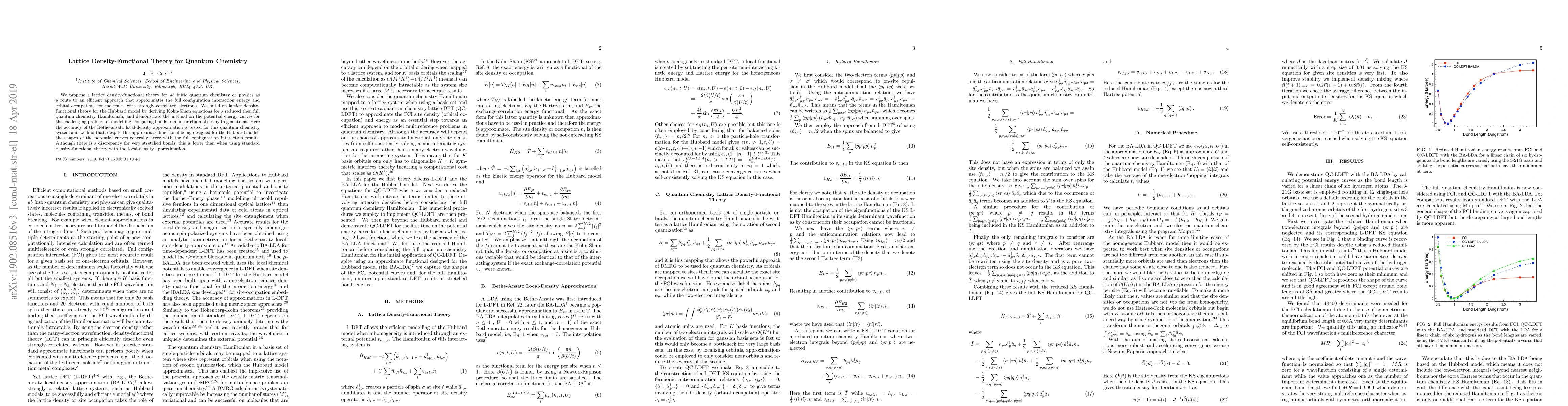 This paper proposes a lattice density-functional theory for quantum chemistry to efficiently approximate the full configuration interaction energy and orbital occupations in molecules with strongly-correlated electrons. The method is tested on a linear chain of six hydrogen atoms, showing that the Bethe-ansatz local-density approximation generally agrees with full configuration interaction results, though with minor discrepancies for very stretched bonds.