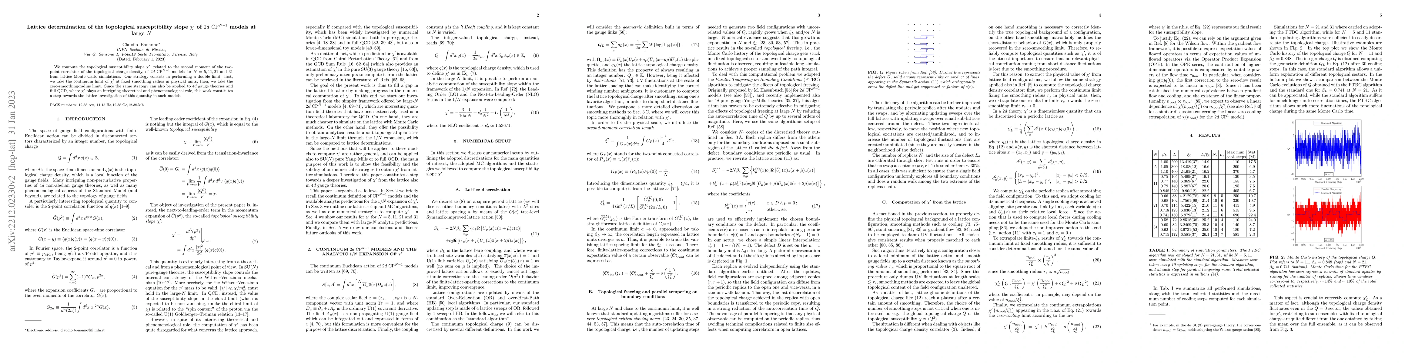 This paper computes the topological susceptibility slope $\chi^\prime$ for $2d~\mathrm{CP}^{N-1}$ models using lattice Monte Carlo simulations for large $N$ values. The study employs a double limit approach to refine the results, paving the way for similar investigations in $4d$ gauge theories and full QCD.