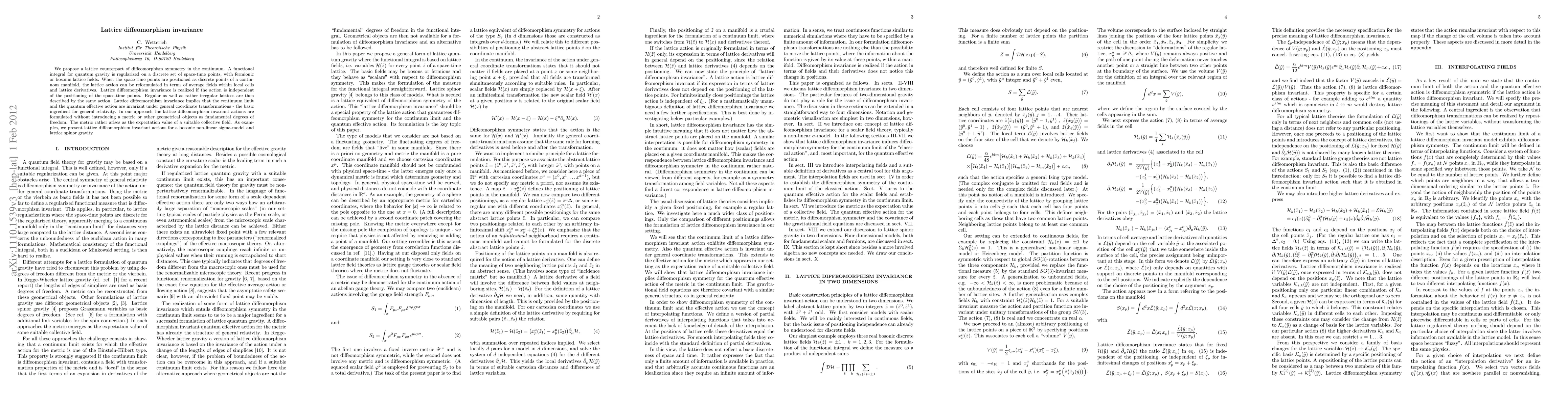 This paper proposes a lattice formulation of diffeomorphism invariance for quantum gravity, demonstrating invariance of the lattice action under the positioning of space-time points. The approach leads to actions that naturally give rise to metrics as collective fields, showing invariance under general coordinate transformations without introducing geometric objects as fundamental.