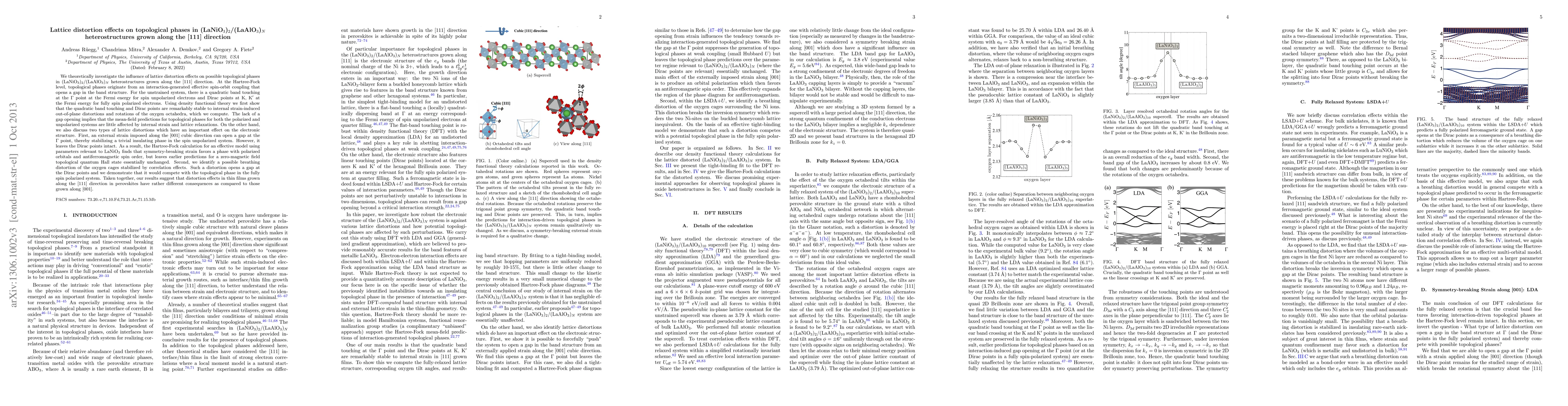 We theoretically investigate the influence of internal and external strain on topological phases in (LaNiO$_3$)$_2$/(LaAlO$_3$)$_N$ heterostructures grown along the [111] direction. At the Hartree-Fock level, topological phases originate from an interaction-generated effective spin-orbit coupling that opens a gap in the band structure. For the unstrained system, there is a quadratic band touching at the $\Gamma$ point at the Fermi energy for unpolarized electrons and Dirac points at K, K$'$ at the Fermi energy for fully polarized electrons. Using density functional theory we show that the quadratic band touching and Dirac points are remarkably stable to internal strain-induced out-of-plane distortions and rotations of the oxygen octahedra, which we compute. The lack of a gap opening from internal strain implies a robustness to the mean-field predicted topological phases for both the polarized and unpolarized systems. We also consider an external strain imposed along the [001] cubic direction and show this can open a gap at the $\Gamma$ point but leaves the Dirac points intact. Finally, we compute a phase diagram for parameters relevant to LaNiO$_3$ which shows that strain favors a phase with polarized orbitals and antiferromagnetic spin order, but leaves earlier predictions for a zero-magnetic field topological quantum Hall state essentially unchanged. Taken together, our results suggest that the [111] growth direction in perovskites may lead to thin films that are relatively immune to distortion effects compared to those grown along [001].