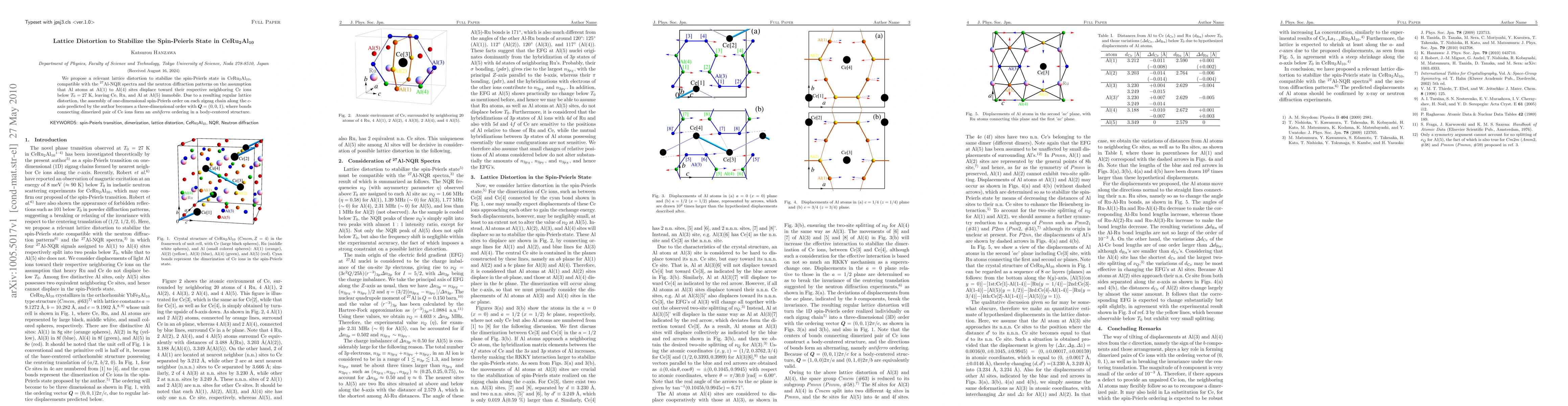 We propose a relevant lattice distortion to stabilize the spin-Peierls state in CeRu2Al10, compatible with the 27Al-NQR spectra and the neutron diffraction patterns on the assumption that Al atoms at Al(1) to Al(4) sites displace toward their respective neighboring Ce ions below T0 = 27 K, leaving Ce, Ru, and Al at Al(5) immobile. Due to a resulting regular lattice distortion the assembly of one-dimensional spin-Peierls order on each zigzag chain along the c-axis predicted by the author becomes a three-dimensional order with Q = (0, 0, 1), where bonds connecting dimerized pair of Ce ions form an antiferro ordering in a body-centered structure.