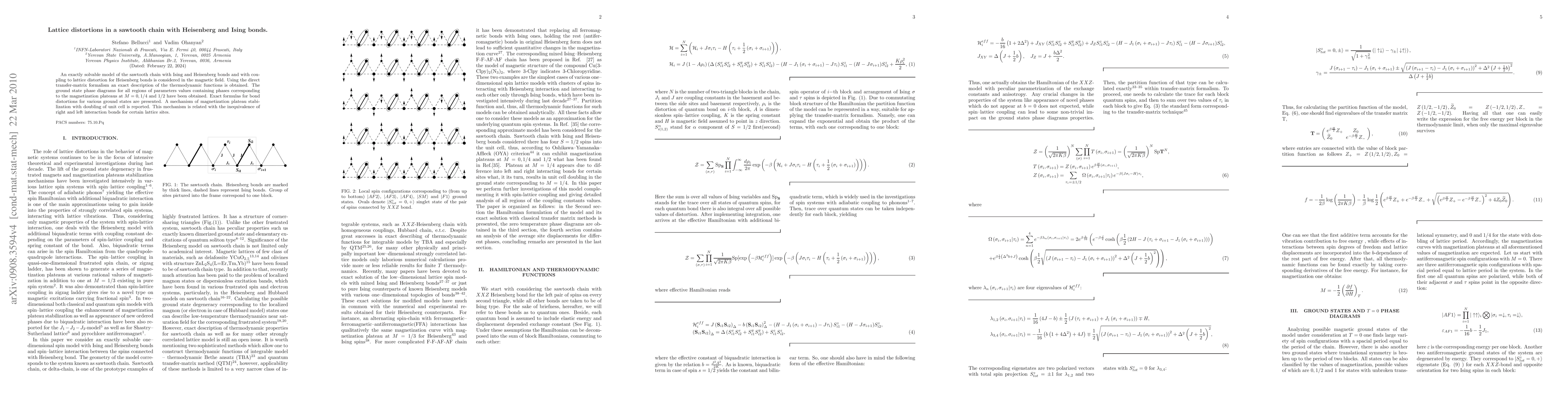 This paper presents an exactly solvable model of a sawtooth chain with Ising and Heisenberg bonds, exploring lattice distortions and magnetic field effects. Using the transfer-matrix formalism, it reveals ground state phase diagrams and magnetization plateaus, including a novel mechanism for stabilizing the $M=1/4$ state.