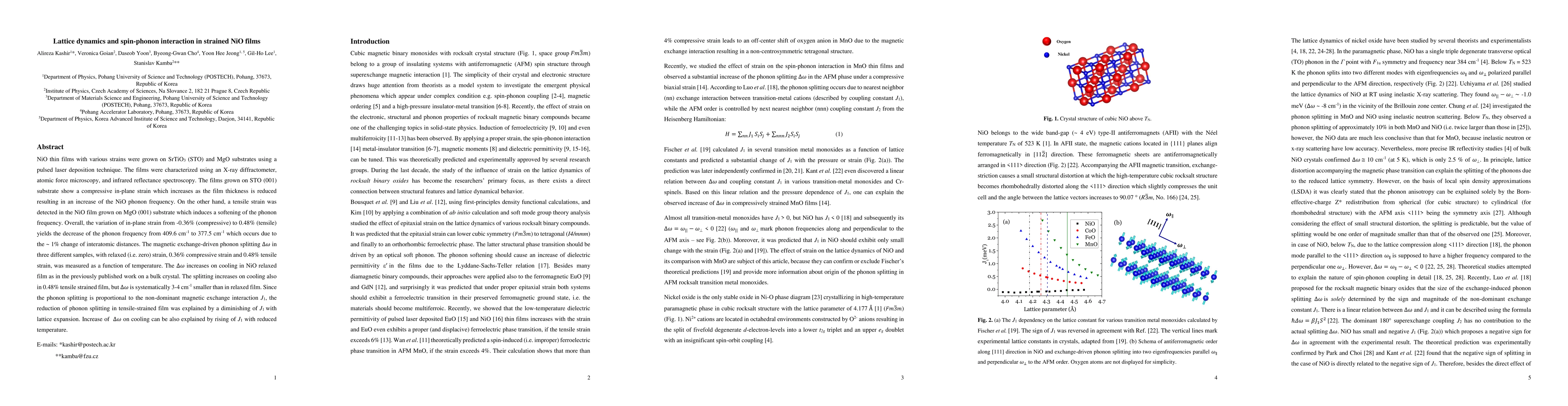 NiO thin films with various strains were grown on SrTiO3 (STO) and MgO substrates using a pulsed laser deposition technique. The films were characterized using an x-ray diffractometer, atomic force microscopy, and infrared reflectance spectroscopy. The films grown on STO (001) substrate show a compressive in-plane strain which increases as the film thickness is reduced, resulting in an increase of the NiO phonon frequency. On the other hand, a tensile strain was detected in the NiO film grown on MgO (001) substrate which induces a softening of the phonon frequency. Overall, the variation of in-plane strain from -0.36% to +0.48% yields the decrease of the phonon frequency from 409.6 cm-1 to 377.5 cm-1 which occurs due to the ~1% change of the inter-atomic distances. The magnetic exchange -driven phonon splitting Delta(W) in three different sample, with relaxed (i.e. zero) strain, 0.36% compressive and 0.48% tensile strain was measured as a function of temperature. The Delta(W) increases on cooling in NiO relaxed film as in the previously published work on a bulk crystal. The splitting increases on cooling also in 0.48% tensile strained film, but Delta(W) is systematically 3-4 cm-1 smaller than in relaxed film. Since the phonon splitting is proportional to the non-dominant magnetic exchange interaction J1, the reduction of phonon splitting in tensile-strained film was explained by a diminishing J1 with lattice expansion. Increase of Delta(W) on cooling can be also explained by rising of J1 with reduced temperature.