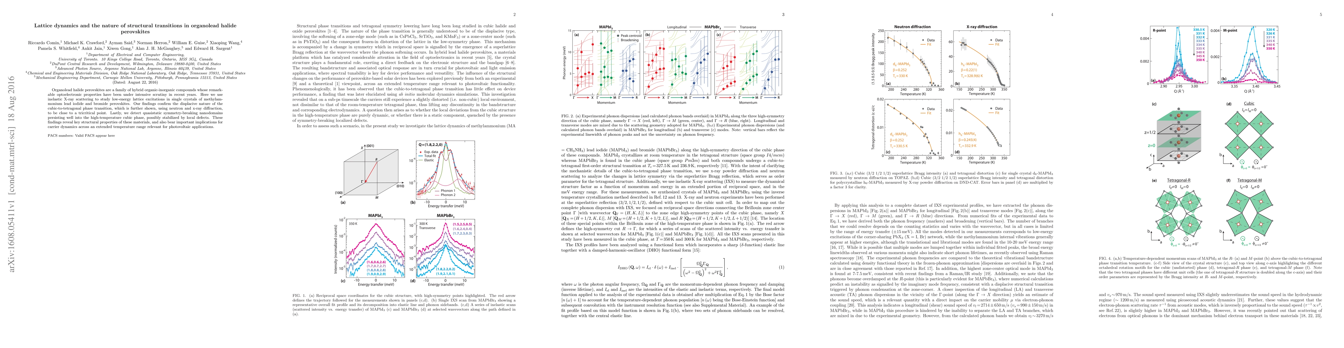 Organolead halide perovskites are a family of hybrid organic-inorganic compounds whose remarkable optoelectronic properties have been under intensive scrutiny in recent years. Here we use inelastic X-ray scattering to study low-energy lattice excitations in single crystals of methylammonium lead iodide and bromide perovskites. Our findings confirm the displacive nature of the cubic-to-tetragonal phase transition, which is further shown, using neutron and x-ray diffraction, to be close to a tricritical point. Lastly, we detect quasistatic symmetry-breaking nanodomains persisting well into the high-temperature cubic phase, possibly stabilized by local defects. These findings reveal key structural properties of these materials, and also bear important implications for carrier dynamics across an extended temperature range relevant for photovoltaic applications.