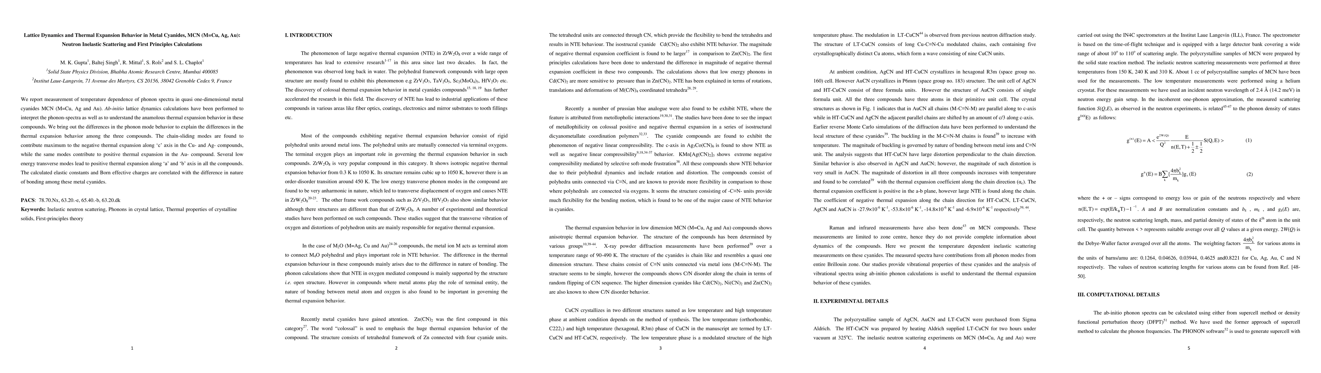We report measurement of temperature dependence of phonon spectra in quasi one-dimensional metal cyanides MCN (M=Cu, Ag and Au). Ab initio lattice dynamics calculations have been performed to interpret the phonon-spectra as well as to understand the anamolous thermal expansion behavior in these compounds. We bring out the differences in the phonon mode behavior to explain the differences in the thermal expansion behavior among the three compounds. The chain-sliding modes are found to contribute maximum to the negative thermal expansion along c axis in the Cu and Ag compounds, while the same modes contribute to positive thermal expansion in the Au compound. Several low energy transverse modes lead to positive thermal expansion along a and b axis in all the compounds. The calculated elastic constants and Born effective charges are correlated with the difference in nature of bonding among these metal cyanides.
